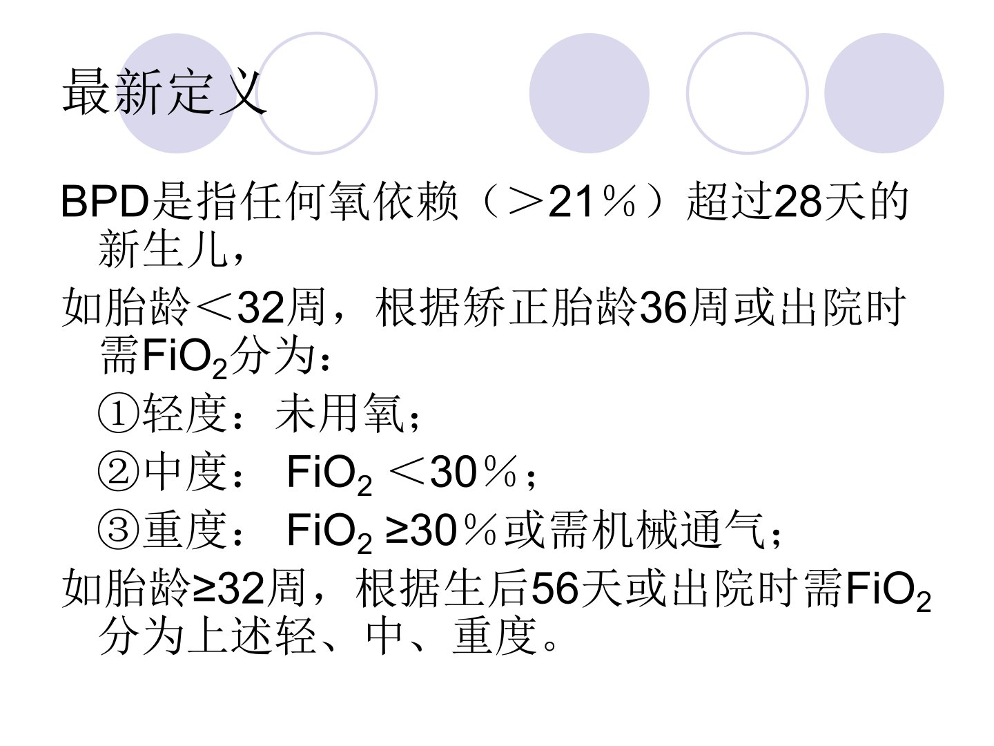 支气管肺发育不良(BPD)又称新生儿慢性肺病是早产儿尤其是小早产儿呼吸系统常见疾病。最新定义中BPD指氧依赖超过28天的新生儿根据胎龄及所需FiO2分为轻、中、重度。其病因多样本质是在遗传易感性基础上氧中毒、气压伤、感染或炎症等不利因素导致发育不成熟的肺损伤及异常修复肺发育不成熟、急性肺损伤、损伤后异常修复是关键环节。临床表现随疾病严重性而异早期症状与原发疾病相似后期逐渐出现呼吸困难、喘憋等症状病程长达数月甚至数年常因继发性呼吸道感染或心力衰竭等加重。胸部X线经典BPD表现为肺充气过度、肺不张等Northway将其分为4期。近年来BPD病理改变和临床表现有变化轻型X线常无明显改变。肺部CT表现为双肺野磨玻璃状改变、多灶充气过度等。治疗包括营养支持、限制液体、氧疗法、使用肾上腺皮质激素等多种方法。