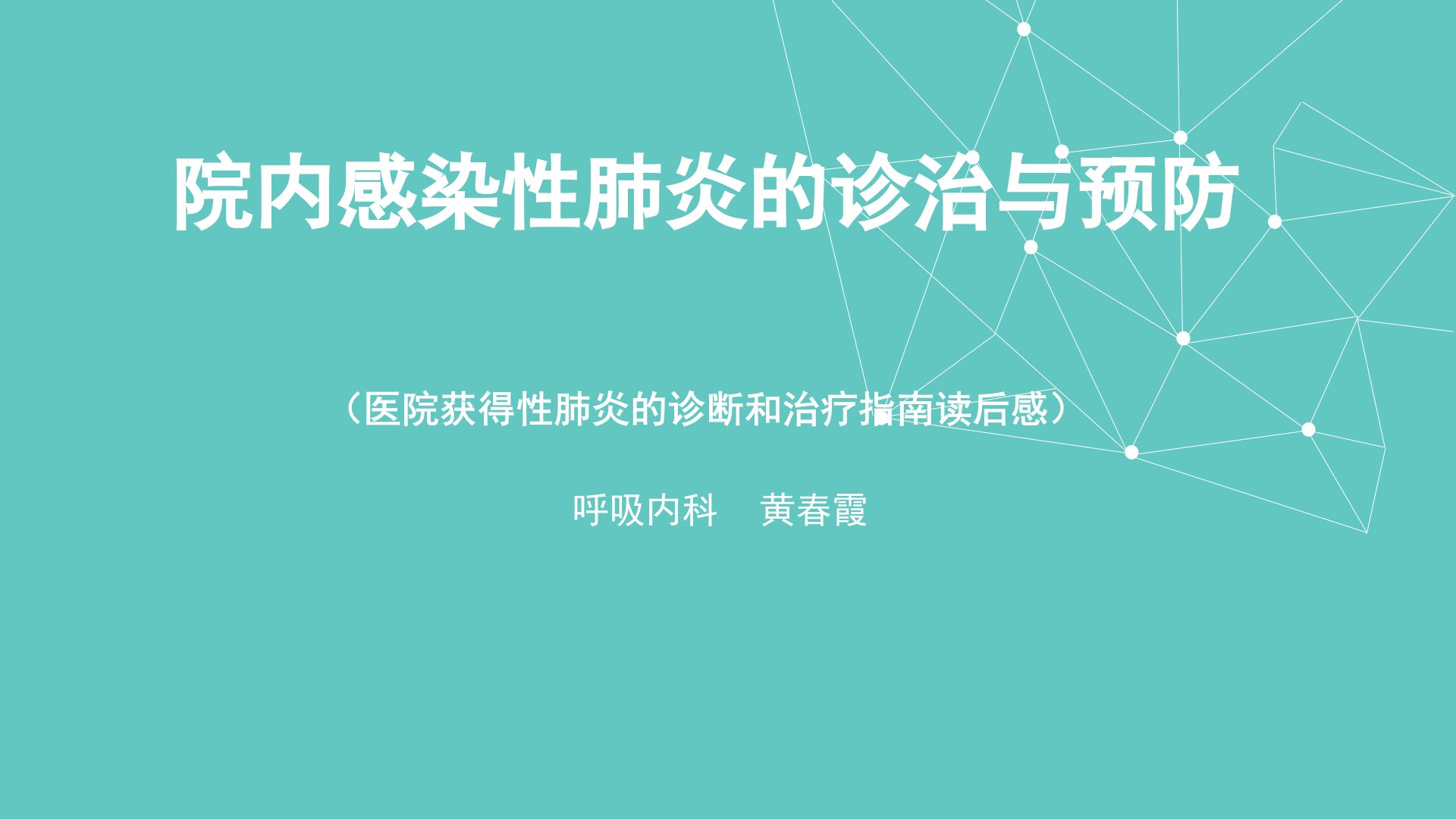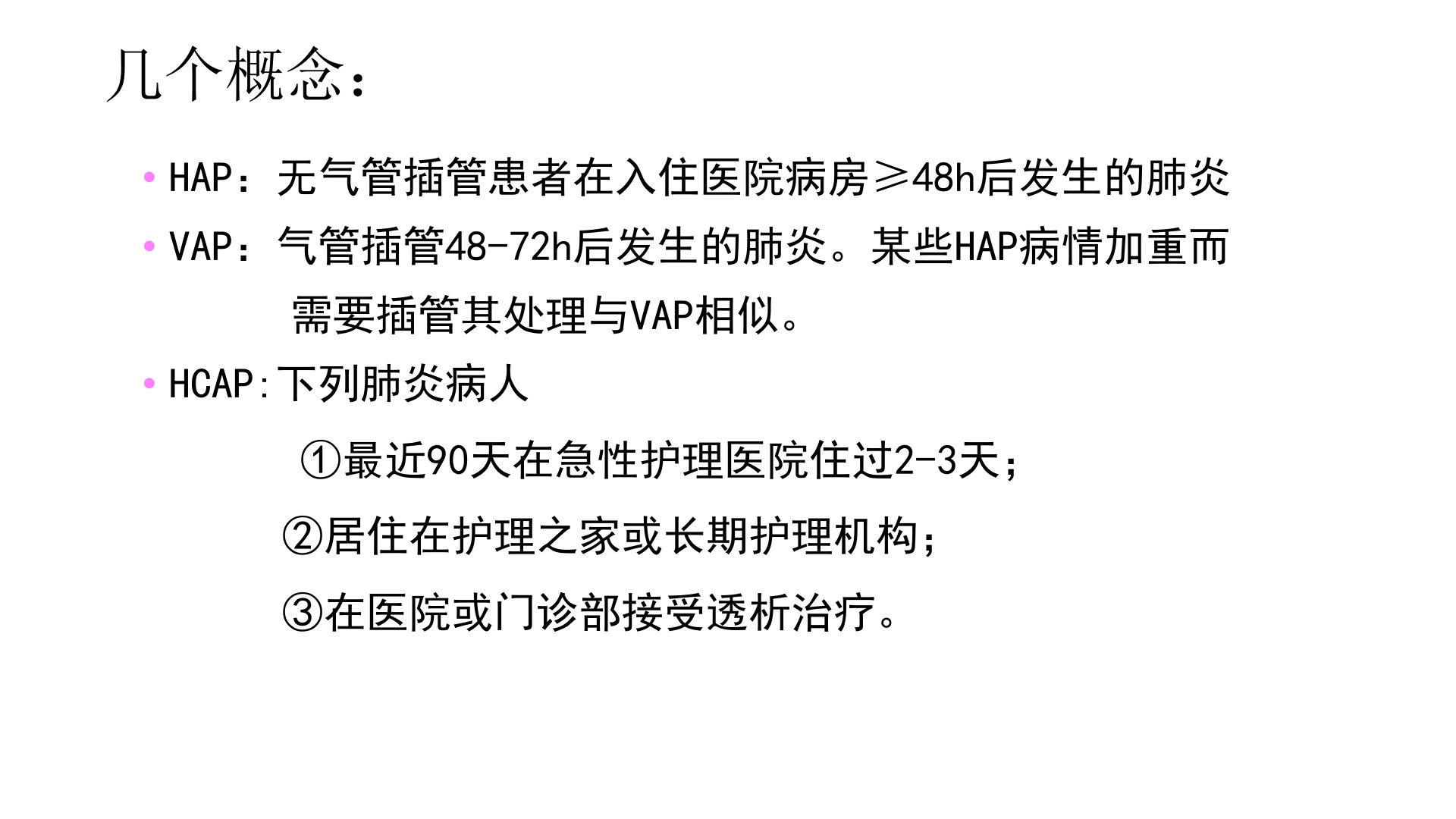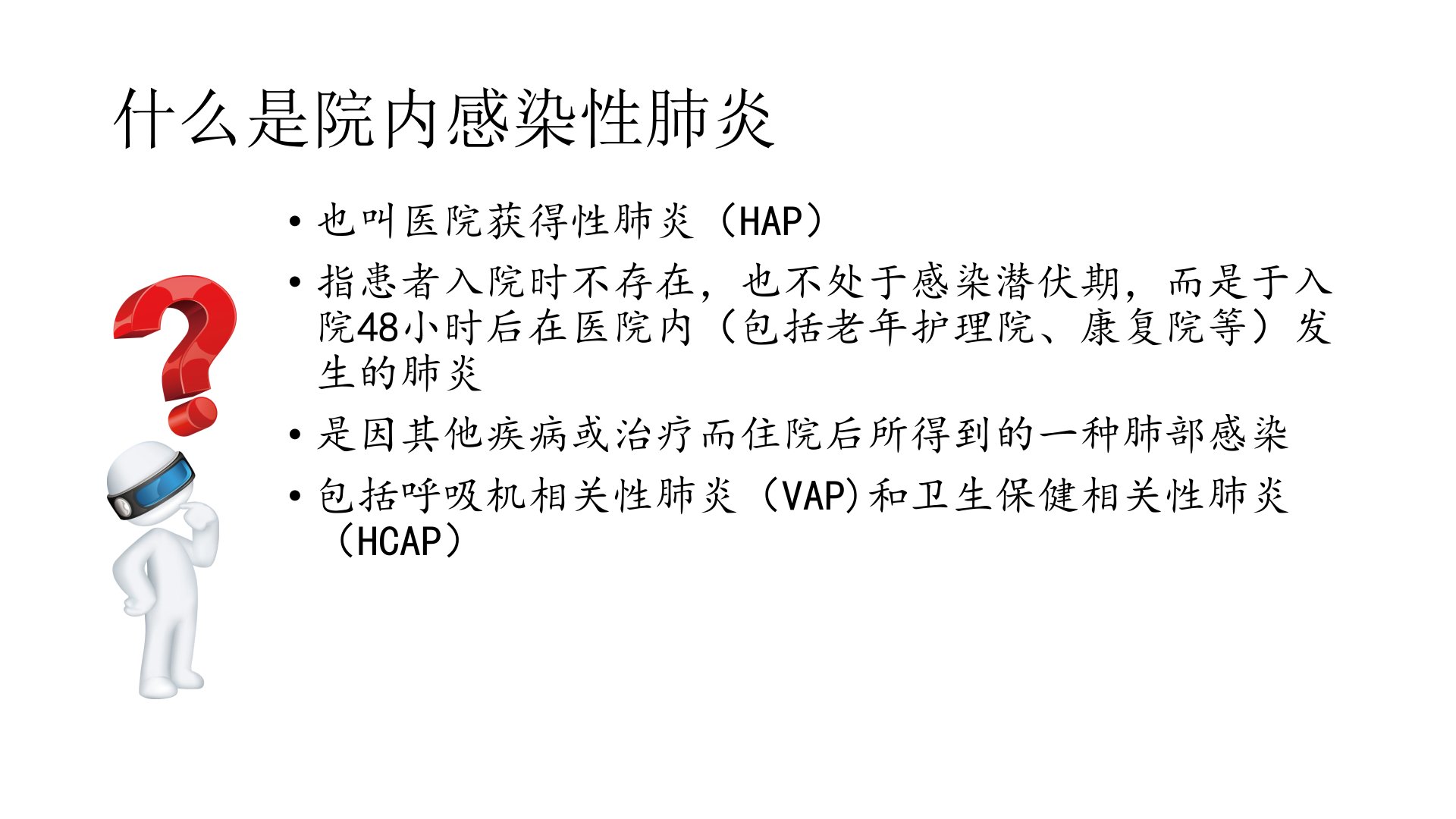 黄春霞医生在《院内感染性肺炎的诊治与预防》一文中对医院获得性肺炎(HAP)的诊治与预防进行了系统阐述。HAP指患者入院48小时后在医院内发生的肺炎包括呼吸机相关性肺炎(VAP)和卫生保健相关性肺炎(HCAP)。其特点为病情严重、耐药率高、治疗困难细菌是最常见病原体占90以上。HAP分为早发和晚发晚发HAP致病菌常为多重耐药菌病死率高。文章指出HAP的发生与患者因素、医护因素及病原微生物来源有关口咽部定植细菌的吸入及气管插管球囊上方积聚细菌的吸入是主要途径。诊断方面HAP临床表现复杂典型症状不常见需结合实验室检查、影像学及病原学检查。治疗强调初始经验性抗菌药物的选择根据有无MDR菌危险因素进行分层治疗并注意使用时机、剂量和疗程。预防措施包括避免气管插管、保持气道清洁、减少有创操作、强化无菌操作和手卫生等。
