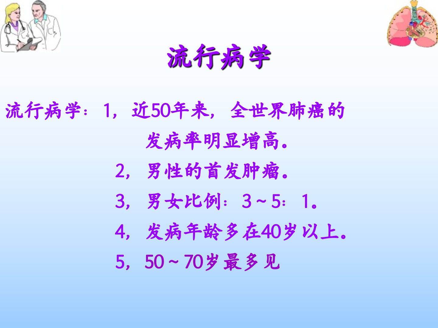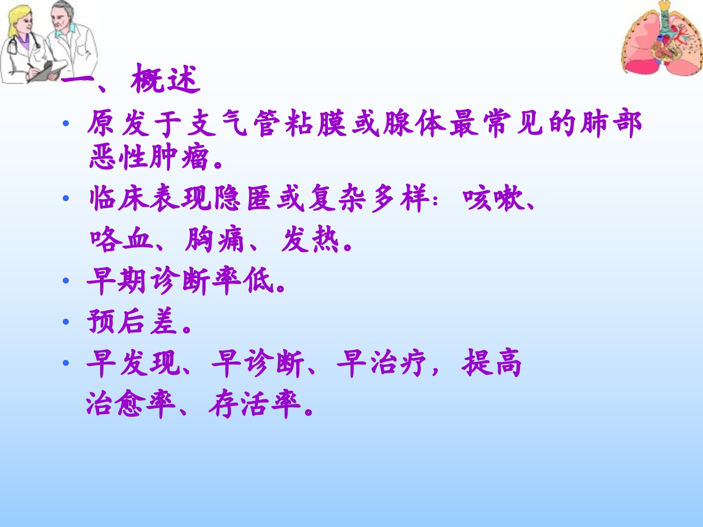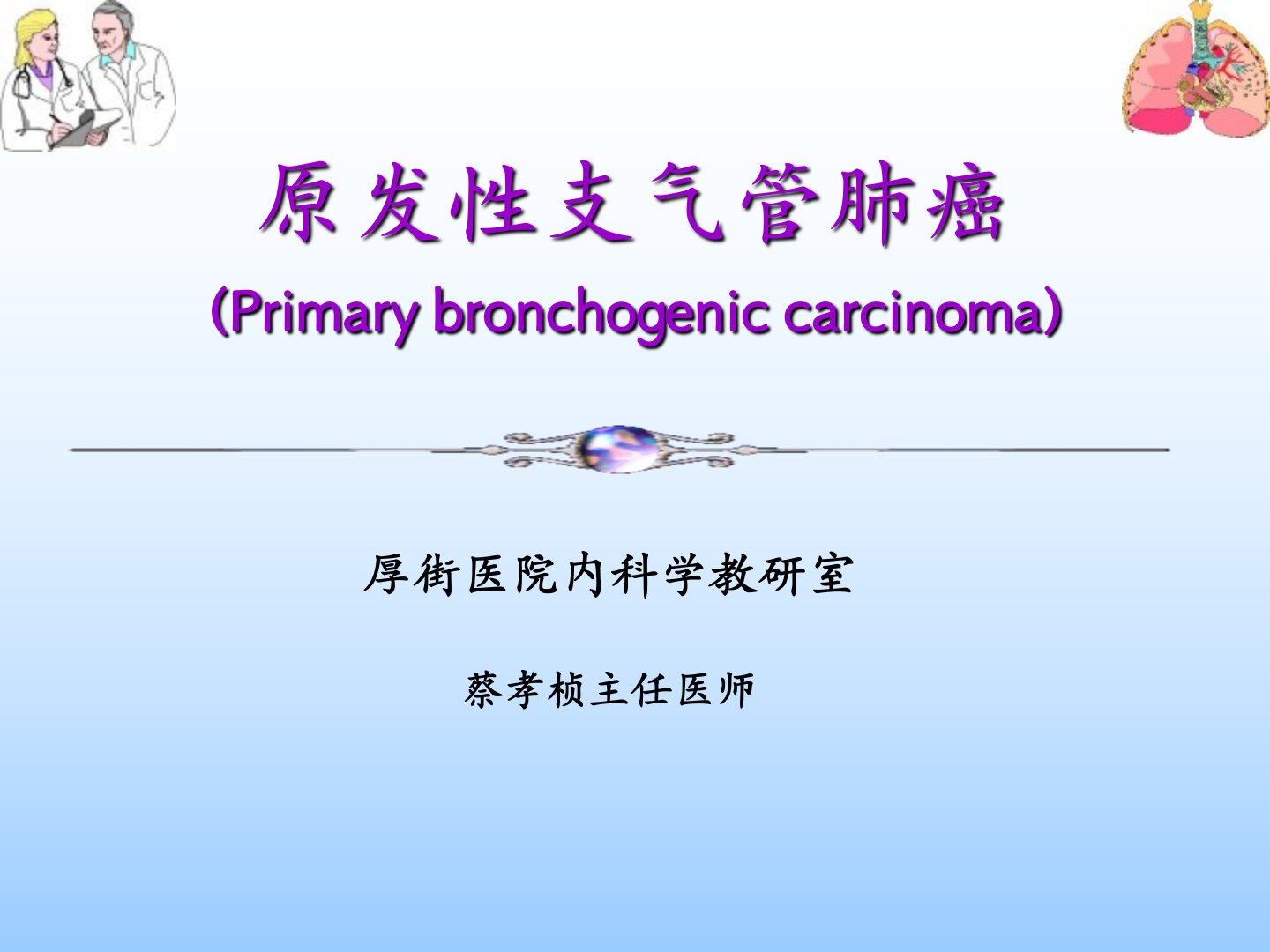 原发性支气管肺癌(Primarybronchogeniccarcinoma)厚街医院内科学教研室蔡孝桢主任医师一、概述原发于支气管粘膜或腺体最常见的肺部恶性肿瘤。临床表现隐匿或复杂多样:咳嗽、咯血、胸痛、发热。早期诊断率低。预后差。早发现、早诊断、早治疗,提高治愈率、存活率。流行病学流行病学:1,近50年来,全世界肺癌的发病率明显增高。2,男性的首发肿瘤。3,男女比例:3~5:1。4,发病年龄多在40岁以上。5,50~70岁最多见二、病因未明确目前公认与以下因素有关(一)吸烟:1.80~90%的男性肺癌与吸烟有关2.致癌物质:3,4–苯并芘等3.病理学改变(磷状上皮化生、核异形变)4.被动吸烟...