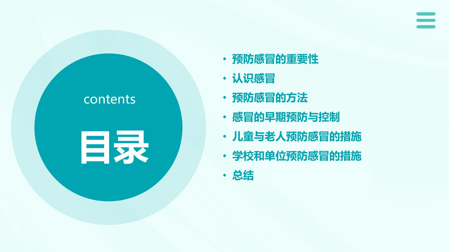 xx年xx月xx日预防感冒ppt摘要:感冒通过呼吸道侵入人体引发鼻塞、咳嗽等症状严重时会导致肺炎、支气管炎甚至危及生命某些感冒病毒还可能导致心肌炎、肾炎等并发症。感冒主要通过飞沫、接触和空气传播。预防感冒需保持个人卫生如勤洗手、不共用餐具;接种流感疫苗;加强锻炼提高免疫力;避免接触病毒源如不去人群密集场所;保持室内通风。感冒初期症状包括轻度发热、咳嗽等随着病情恶化可能出现喉咙痛、头痛等症状严重感冒会导致高烧、乏力等。感冒由病毒引起通过空气飞沫传播免疫力下降和环境因素会增加感冒风险。预防感冒需注意保暖坚持有氧运动保持室内空气流通避免去拥挤场所。儿童与老人应合理安排饮食适度运动及时接种疫苗。学校和单位应定时开窗通风宣传防感冒知识减少聚集活动。预防感冒可减少疾病发生率减轻症状避免并发症提高生活质量。