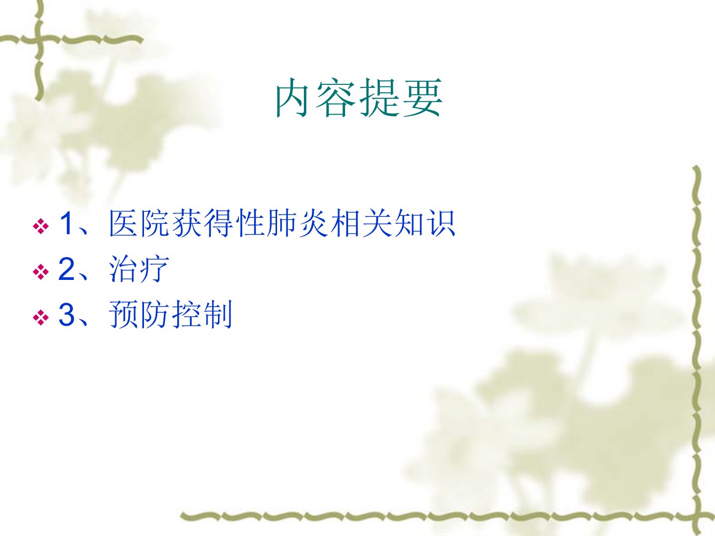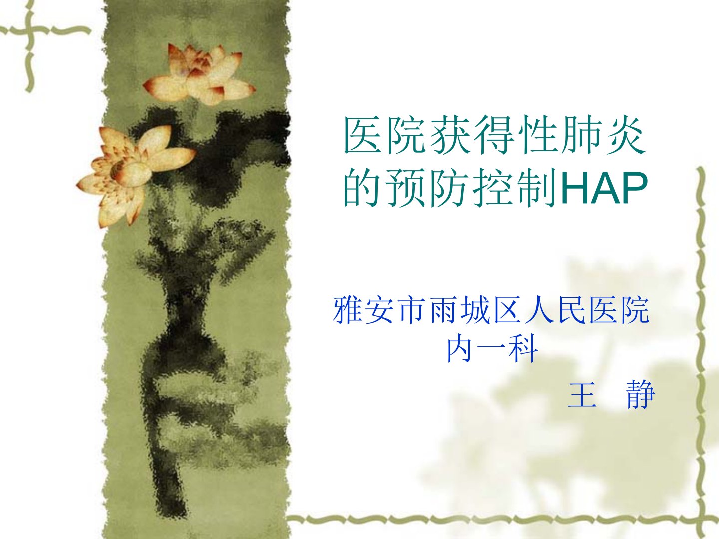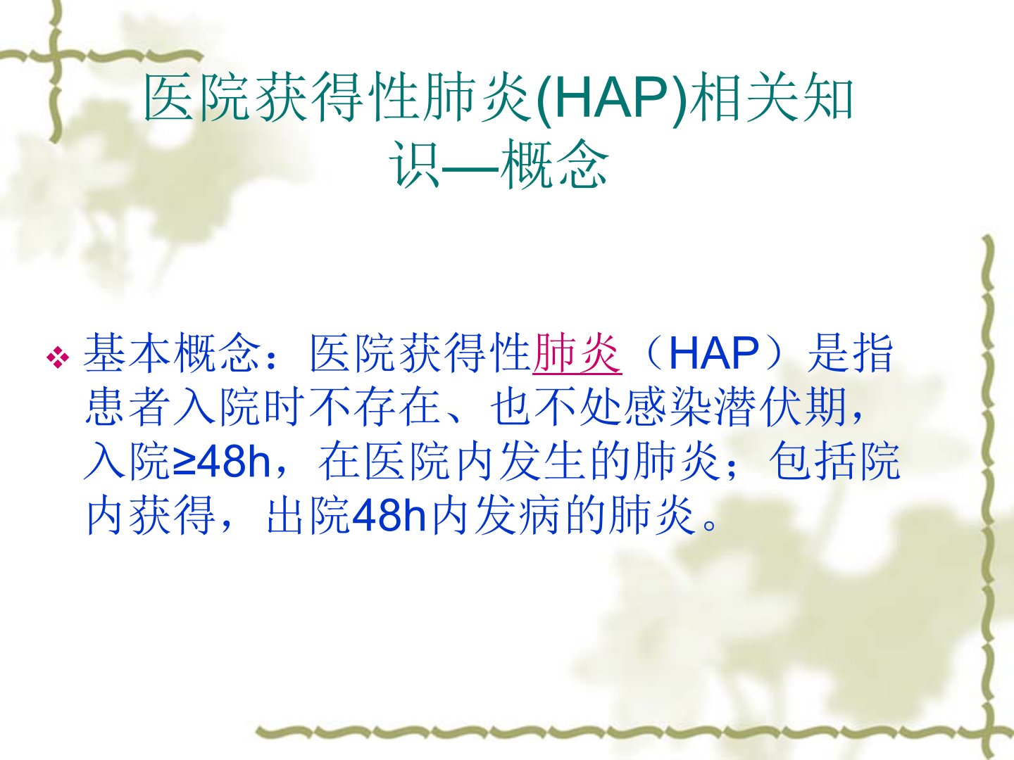医院获得性肺炎(HAP)指患者入院时不存在、也不处于感染潜伏期而在入院后发生的肺炎其中机械通气相关肺炎是特殊类型。HAP流行病学特征明显病原学复杂多样。易感因素中气管插管与机械通气是重要风险因素。临床诊断标准主要依据X线片显示新的肺炎性改变等表现。确定诊断则需满足临床诊断标准且具备以下任一条件:痰培养两次病原菌相同、痰定量培养病原菌浓度达标、血或胸水培养出病原菌、人工气道吸出或经纤支镜防污染毛刷获得病原菌、血清学病理学病原学证据或痰中检出特殊病菌。临床表现因机械通气等因素而异。预防和控制方面需加强口腔护理、休息与活动管理、有效引流、体位调整、正确吸痰、声门下分泌物引流以及呼吸机相关设备处理同时减少插管天数并严格遵守手卫生规范。