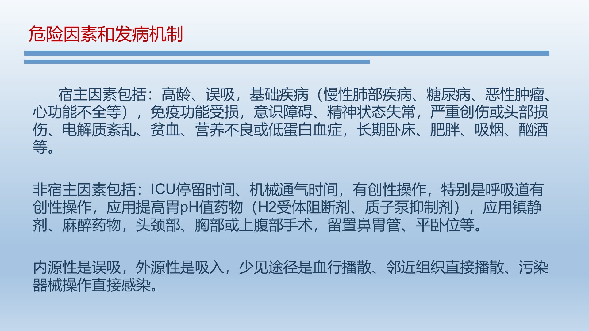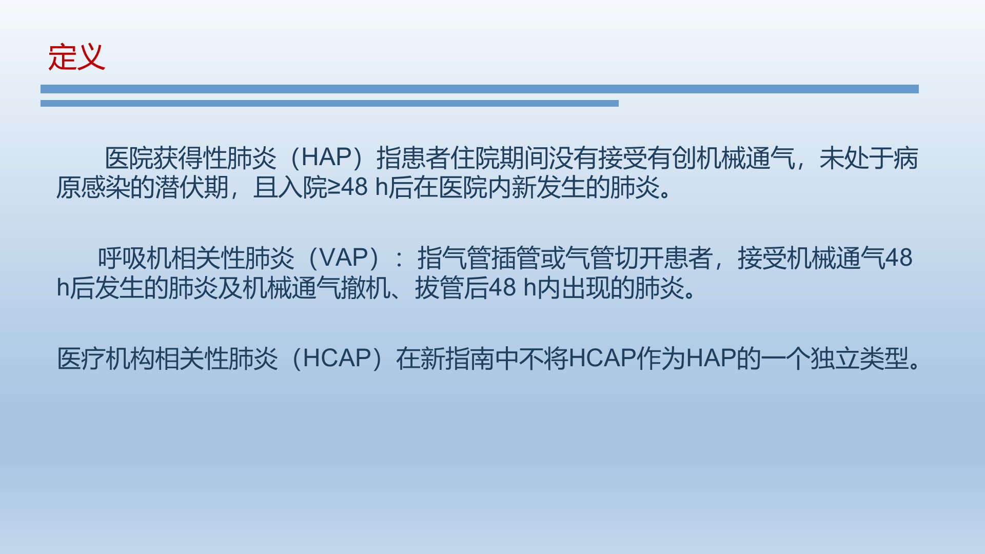 医院获得性肺炎(HAP)指患者住院期间未处于病原感染潜伏期且入院48h后新发的肺炎。呼吸机相关性肺炎(VAP)指气管插管等患者接受机械通气48h后或撤机、拔管48h内出现的肺炎。医疗机构相关性肺炎(HCAP)不再作为HAP独立类型。危险因素分宿主与非宿主因素前者包括高龄、基础疾病等后者涵盖ICU停留时间、有创操作等。我国HAP、VAP病原谱与国外不同首位是鲍曼不动杆菌且多重耐药情况有变化。临床诊断以表现、影像学检查为依据肺超声有助诊断。诊疗思路为判断诊断、安排病原学检查、及时经验性抗感染治疗、动态评估、失败再评估。对于疑似HAP(非VAP)患者建议根据微生物学培养结果治疗使用临床标准而非生物标记物等启动抗生素治疗。初始治疗应根据本地耐药数据指导建议定期制作当地抗菌谱经验性治疗依病原菌分布和药敏选择。特殊病原菌感染有不同用药建议治疗疗程上HAP建议7天且建议抗菌治疗降阶梯。