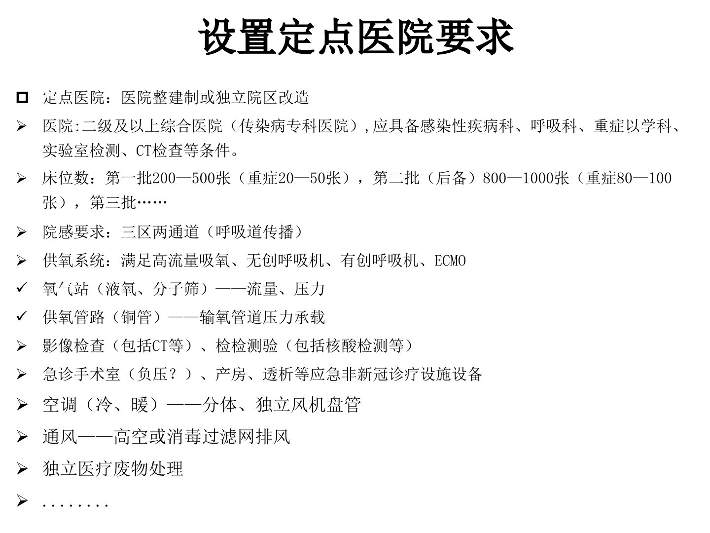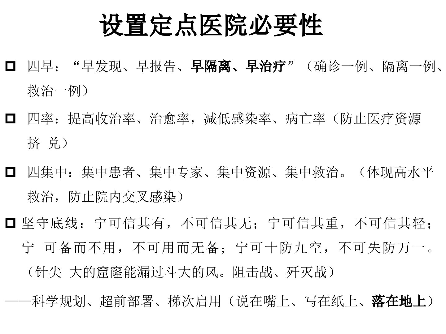 新冠肺炎定点医院设置方案强调“四早”(早发现、早报告、早隔离、早治疗)、“四率”(提高收治率、治愈率降低感染率、病亡率)及“四集中”(集中患者、专家、资源、救治)原则坚守防患未然底线要求科学规划、超前部署、梯次启用。定点医院应选二级及以上综合医院或传染病专科医院具备相关科室和条件床位分批设置满足重症需求。院感应符合“三区两通道”标准供氧系统完善配备影像检查、检测检验等设施。启用方面确诊超10例即整建制启用第一批收治达50即启用第二批。人员储备需预案明确包括本院调配及支援需求组建多级专家团队及联合职能部门。设备物资按710天满负荷运行储备建章立制遵循第七版诊疗规范。中国特色社会主义制度优势、党的建设、高质量医疗服务及文化建设是制胜法宝。