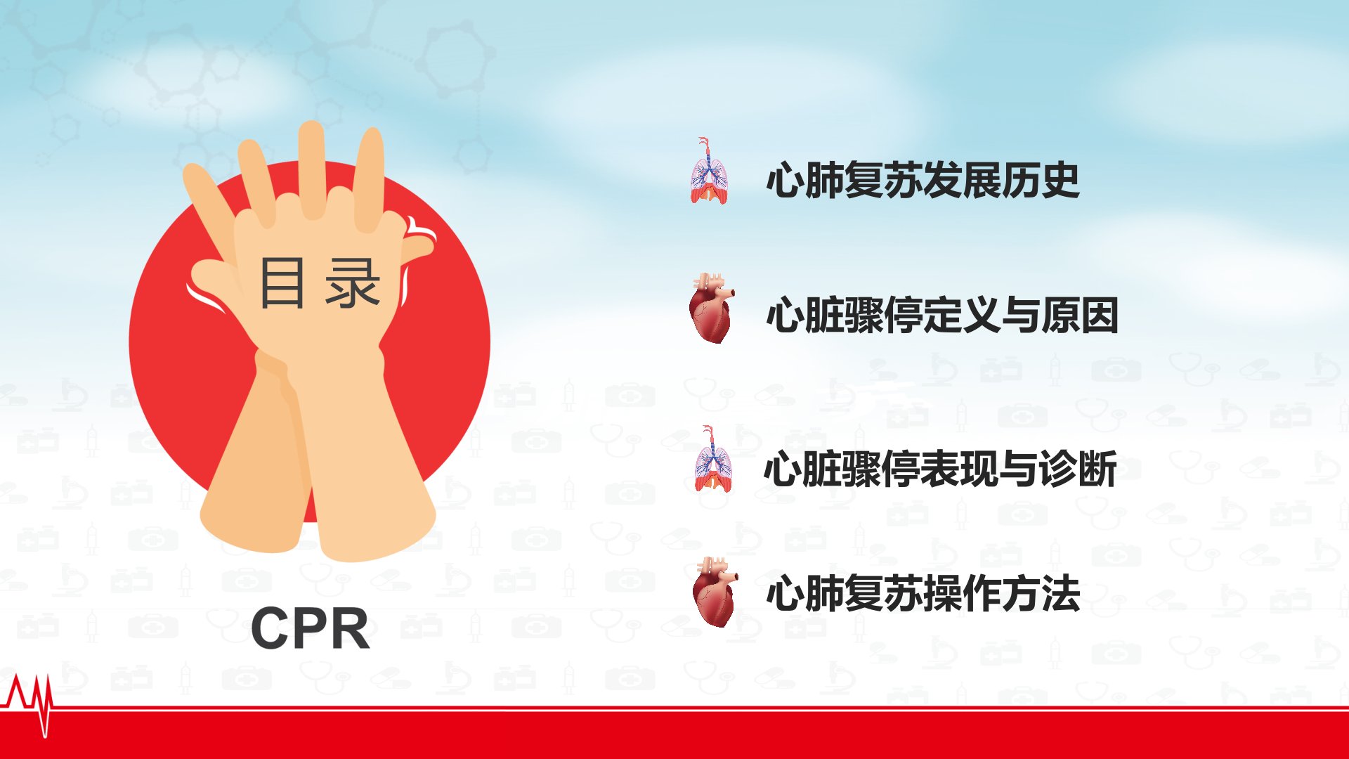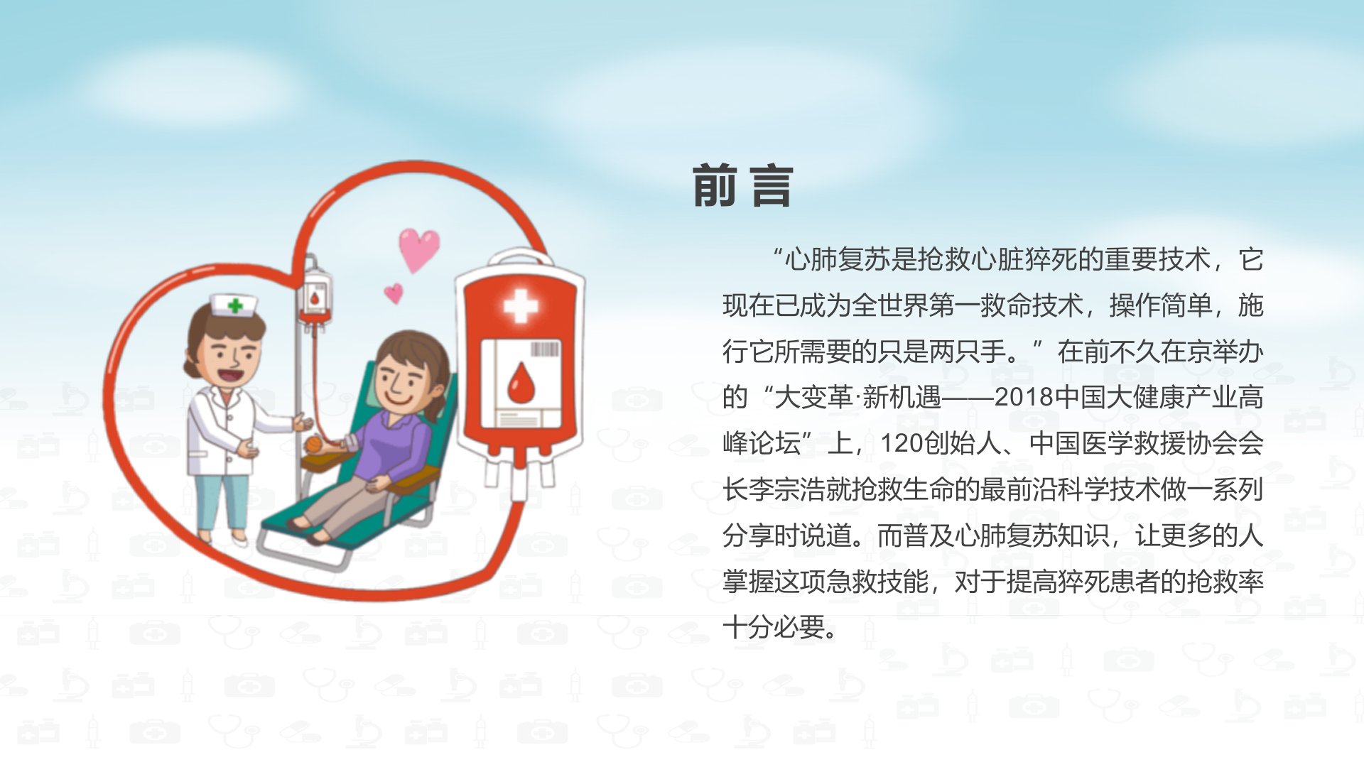 心肺复苏摘要发展历史美国的PeterSafar、James和Elam医生率先采用人工呼吸复苏病人ZOLL提出电击除颤、人工呼吸与胸外按压结合构成现代心肺复苏术(CPR)此后CPR每隔5年更新指南。封闭式胸部心脏按压与人工呼吸结合标志CPR诞生后强调脑和神经系统功能恢复诞生心肺脑复苏新标准。心脏骤停心脏骤停指心脏射血功能突然终止大动脉搏动与心音消失重要器官缺血缺氧致生命终止医学上又称猝死是公共卫生和临床医学最危急情况之一。患者表现为心脏机械活动突然停止刺激无反应无脉搏、自主呼吸或濒死喘息等若不及时救治常致即刻死亡。表现与诊断心音消失、脉搏扪不到、血压测不出、意识丧失或伴抽搐、呼吸断续后停止、瞳孔散大、面色苍白青紫等。操作方法心肺复苏操作方法包括人工呼吸(B)、胸部按压(C)、开放气道(A)。