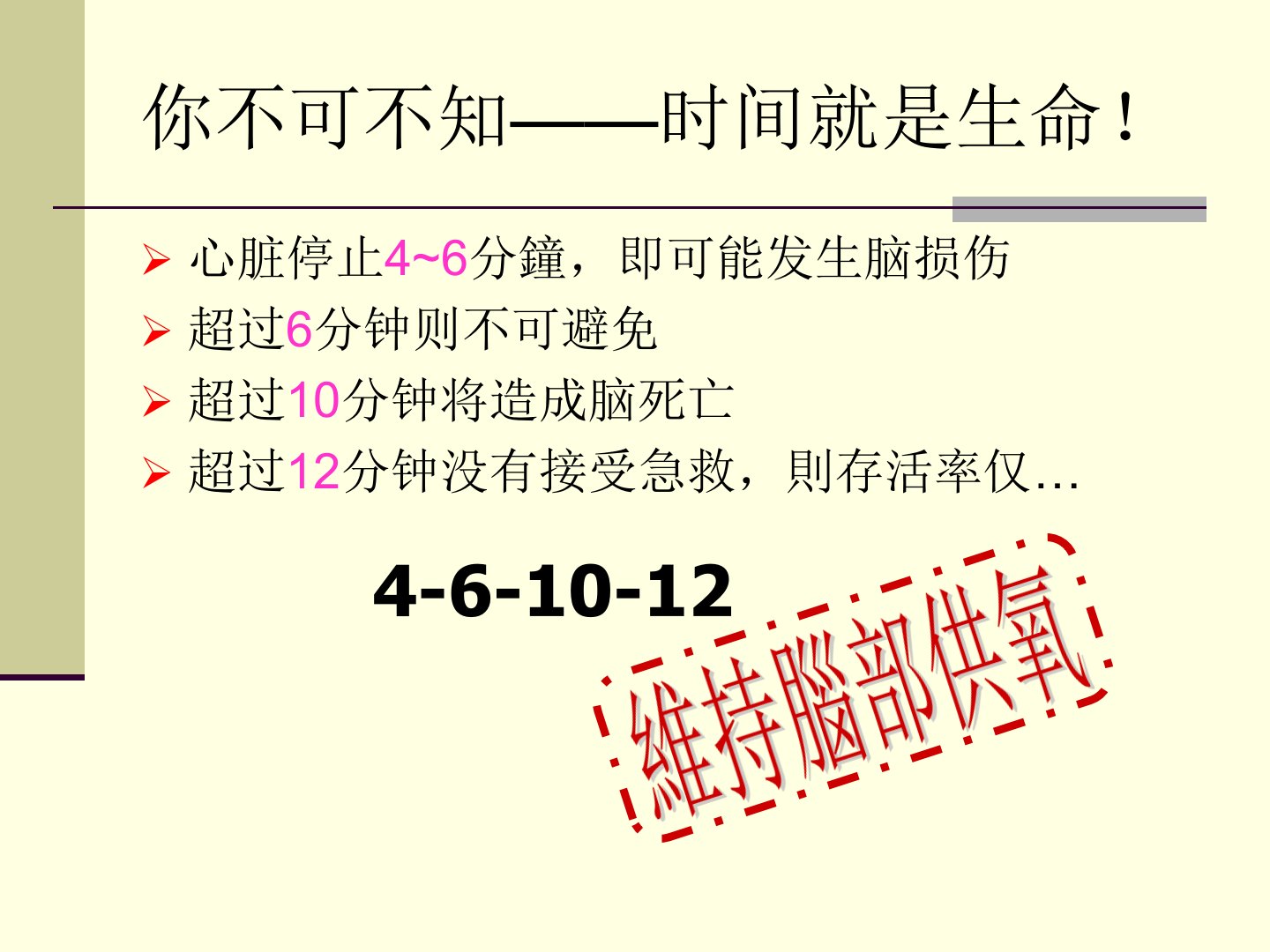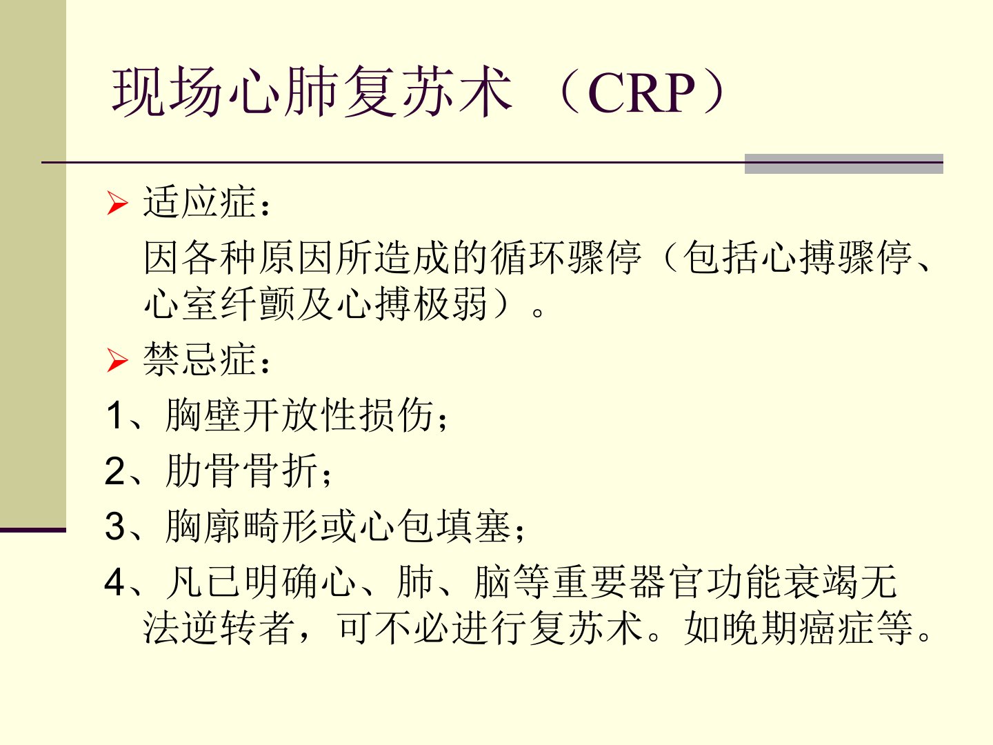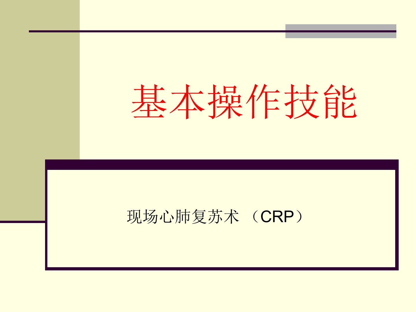 基本操作技能现场心肺复苏术(CRP)现场心肺复苏术(CRP)适应症:因各种原因所造成的循环骤停(包括心搏骤停、心室纤颤及心搏极弱)。禁忌症:1、胸壁开放性损伤;2、肋骨骨折;3、胸廓畸形或心包填塞;4、凡已明确心、肺、脑等重要器官功能衰竭无法逆转者,可不必进行复苏术。如晚期癌症等。你不可不知——时间就是生命!心脏停止4~6分鐘,即可能发生脑损伤超过6分钟则不可避免超过10分钟将造成脑死亡超过12分钟没有接受急救,則存活率仅…4-6-10-12越快越好thesoonerthebetter存活链概念(ChainofSurvival)生存链(ChainofSurvival)早期识别和启动急救医疗系统...