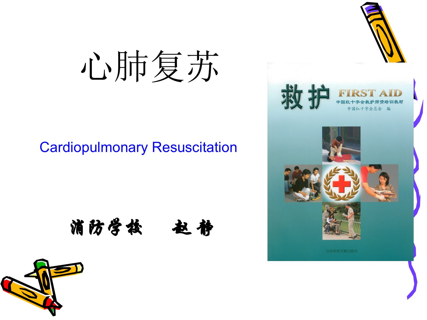 心肺复苏消防学校 赵静CardiopulmonaryResuscitation一、概述(一)概念心搏骤停是指心脏突然停止跳动,有效泵血功能消失,引起全身严重缺氧、缺血。心搏骤停的类型:心室颤动(室颤)缓慢而无效的心室自主节律心脏或心室停顿(二)心搏骤停的原因心脑血管疾病(冠心病、心内膜疾病、心肌疾病)非心脏血管疾病(意外事件、中毒、休克、药物中毒)呼吸停止麻醉意外和手术中意外其他(血管造影、心导管检查)心搏骤停环及心搏骤停发生原因过敏因子心肌炎麻醉药酸中毒缺氧低温心脏传导阻滞迷走神经兴奋交感神经兴奋高碳酸血症冠心病冠脉栓塞冠脉痉挛休克心肌梗死、缺氧、电解质紊乱心音消失脉搏扪不到,血压测不出意识...