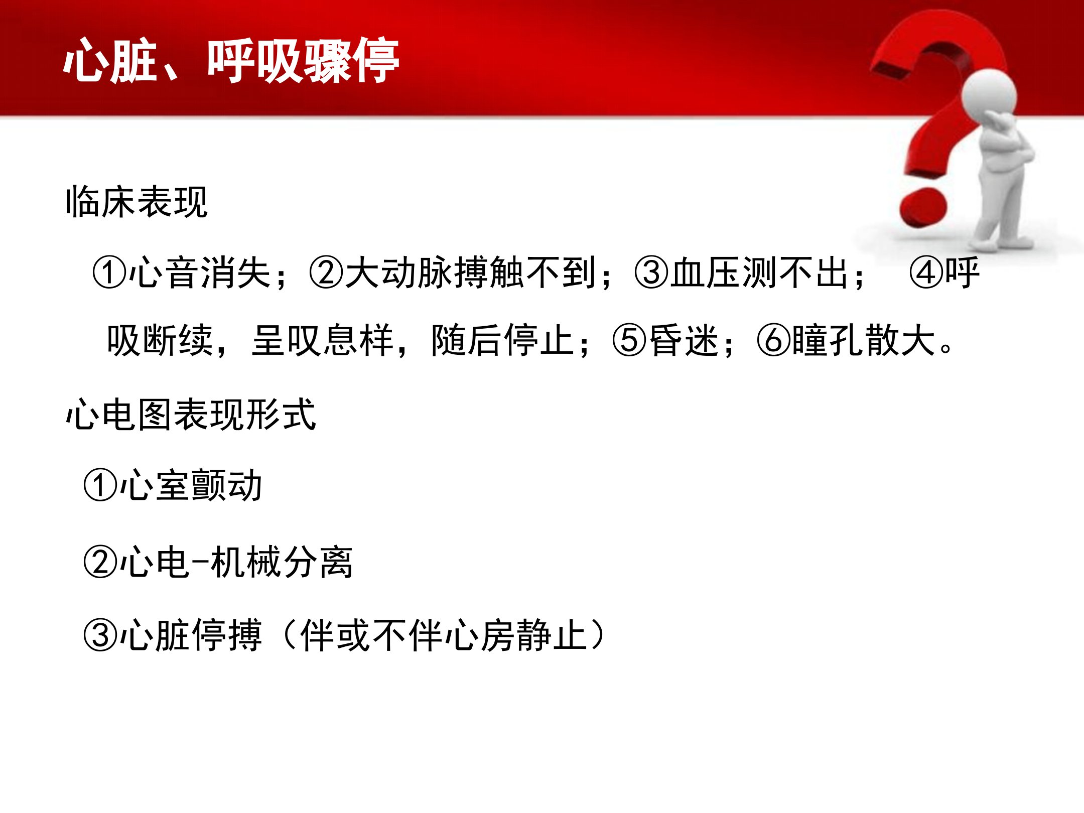 心肺复苏与电除颤心脏、呼吸骤停临床表现①心音消失;②大动脉搏触不到;③血压测不出;④呼吸断续,呈叹息样,随后停止;⑤昏迷;⑥瞳孔散大。心电图表现形式①心室颤动②心电-机械分离③心脏停搏(伴或不伴心房静止)心肺复苏基本步骤C.胸外心脏按压A.建立人工气道B.人工呼吸2010年国际心肺复苏指南1.发现病人倒地,确认现场是否存在危险因素,以免影响救治。2.判断病人意识,(注意做到轻拍重唤!)如无反应,立即呼救并拨打急救电话或请求他人拨打。3.立即将病人置于复苏体位(平卧位),触摸颈动脉,未触及立即施行胸外心脏按压!4.按压30次后立即开放气道,进行口对口人工呼吸。?人工呼吸与胸外按压比例为2:30。...