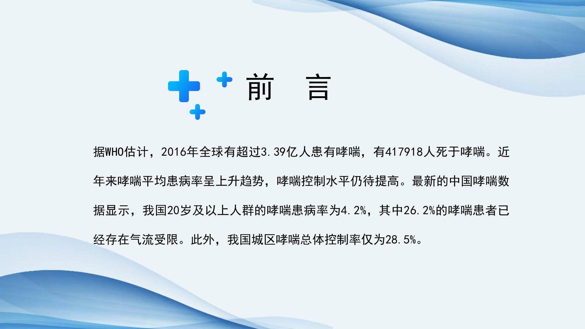 防治哮喘正确认识哮喘远离“会呼吸的痛”摘要据WHO数据2016年全球超339亿人患哮喘417918人死于哮喘我国20岁及以上人群哮喘患病率为42城区总体控制率仅285。世界哮喘日每年5月第一个周二2022年5月3日是第二十四个世界哮喘日旨在加强人们对哮喘的了解增强防治和管理意识。哮喘是慢性气道炎症性疾病有过敏性、非过敏性之分反复发作会损害呼吸功能影响生活工作儿童还影响生长发育。其诱因包括遗传和环境因素。控制哮喘有“四早”原则过敏体质者、精神压力大者、空气污染严重区域者、鼻炎患者等易发人群要重点防护。哮喘存在诸多误区如认为只有呼吸困难才是哮喘、自行停药、认为哮喘长大自然好、认为哮喘治不好肯定经常犯、认为没有遗传或过敏史就不会患哮喘、认为运动可引发哮喘不能运动等。哮喘患者要自我防护远离过敏源佩戴口罩注意保暖禁烟禁酒合理饮食室内通风保持良好心态适当锻炼随身携带药物定期就医。