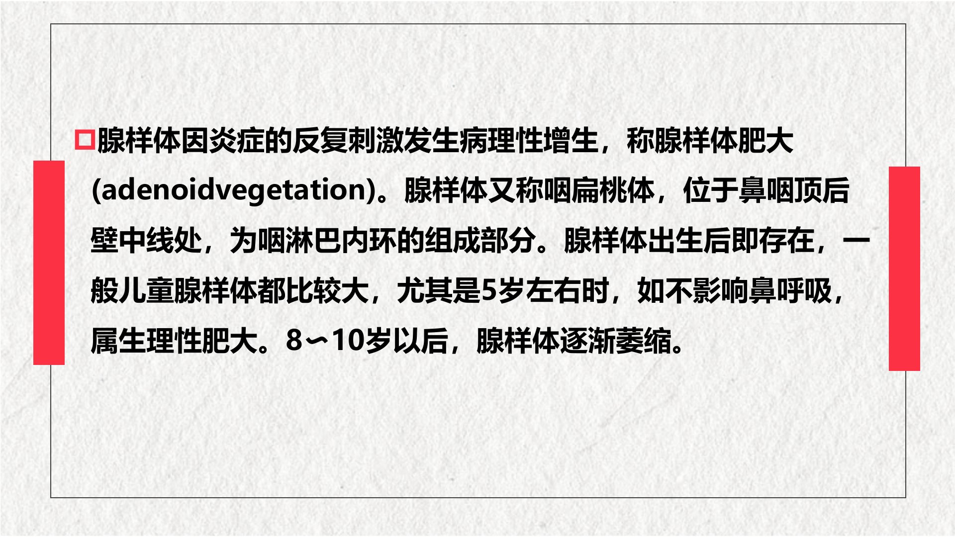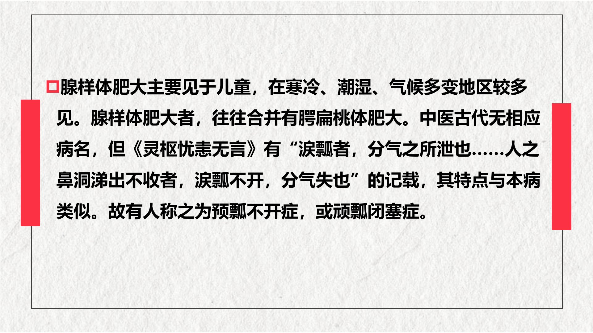 腺样体因炎症反复刺激发生病理性增生称腺样体肥大多见于儿童寒冷、潮湿地区多发常合并腭扁桃体肥大。其病因主要是鼻咽部炎症刺激或鼻炎、鼻窦炎脓性分泌物长期刺激病理表现为腺样体表面黏膜变化、淋巴组织增生等。病机包括气虚痰凝和气血瘀阻。临床表现有局部症状如鼻阻塞、张口呼吸等耳部症状如听力减退以及腺样体面容;全身症状包括厌食、发育差等。体征为咽部黏膜充血鼻咽顶及后壁有肥厚分叶状淋巴组织。诊断可通过鼻咽检查、影像学检查。治疗上手术是有效方法应掌握好手术时机也可用中药治疗。一般治疗包括合理饮食、预防感冒等。中医根据证候不同采用益气健脾化痰散结或活血化瘀散结开窍等治法。中西医结合治疗对于中重度腺样体肥大也有效。预防需注意营养提高免疫力积极治疗相关疾病。