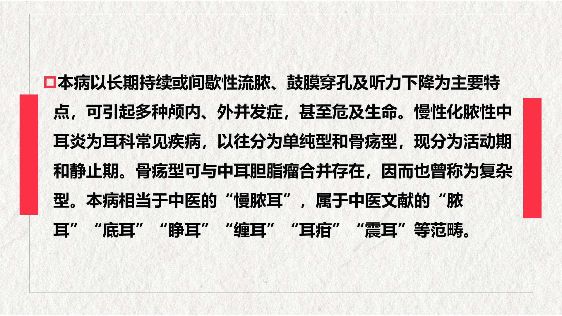 慢性化脓性中耳炎是中耳黏膜、骨膜或深达骨质的慢性化脓性炎症以长期流脓、鼓膜穿孔及听力下降为特点可引起多种并发症分为活动期和静止期。其病因常因急性化脓性中耳炎治疗不当迁延所致上呼吸道感染、污水入耳、患者抵抗力低下等均可诱发或加重致病菌以革兰阴性菌多见。病理上单纯型病变主要位于鼓室骨疡型组织破坏较广泛病变深达骨质。临床表现上单纯型表现为耳内间歇性流脓骨疡型则长期持续流脓且常有臭味。诊断主要依据耳内流脓、鼓膜穿孔及听力下降结合影像学检查明确病变类型。治疗需控制感染、保证引流、清除病灶包括病因治疗、局部治疗、手术治疗及辨证论治。预防需彻底治愈急性化脓性中耳炎、增强体质、保持外耳道清洁、防止污水入耳密切观察病情变化。