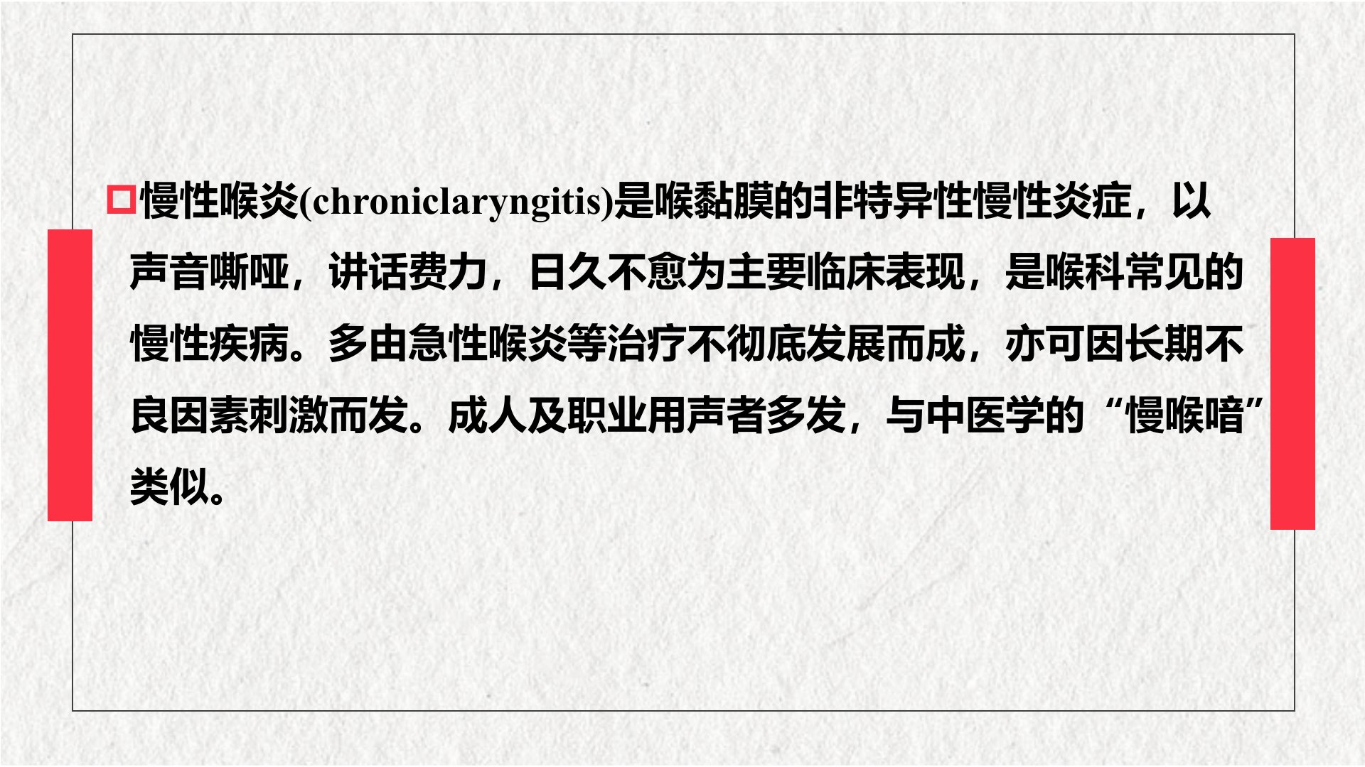 慢性喉炎是喉黏膜的非特异性慢性炎症以声音嘶哑、讲话费力日久不愈为主要表现多由急性喉炎治疗不彻底或长期不良因素刺激发展而来成人及职业用声者多发。其病因可能与急性喉炎反复发作、长期用声过度、吸烟饮酒过度、粉尘及有害气体刺激、临近器官慢性炎症等因素有关。病理上表现为喉腔黏膜充血、水肿等可进一步发展为慢性单纯性喉炎、慢性肥厚性喉炎、慢性萎缩性喉炎。中医病机认为与脏气虚损、喉窍失养有关。治疗原则为消除致病因素、避免不良刺激、注意声带休息中医中药为首选配合局部治疗可提高疗效。中西医结合、辨证与辨病相结合的诊疗方法效果更佳。预防需锻炼身体、积极治疗炎症、纠正发声方法、改善环境、戒烟限酒等。