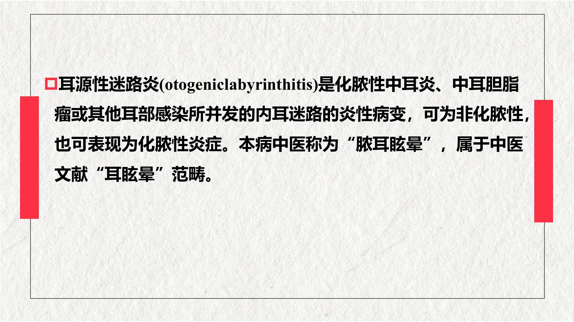 耳源性迷路炎otogeniclabyrinthitis是化脓性中耳炎等耳部感染并发的内耳迷路炎性病变中医称“脓耳眩晕”。【病因病理】包括1病因:局限性迷路炎多因中耳胆脂瘤或骨疡型中耳炎形成瘘管;浆液性迷路炎是局限性迷路炎发展而来毒素进入内耳引发;化脓性迷路炎是细菌侵入内耳膜迷路所致。2病理:不同类型迷路炎病变程度和病理特征不同。3病机:肝胆风火上扰、脾虚湿浊上泛、肾阴亏损耳窍失养均可致病。【临床表现】不同类型迷路炎症状、体征有差异局限性迷路炎表现为发作性眩晕等;浆液性迷路炎主要是眩晕、眼震等;化脓性迷路炎症状更重眩晕严重患耳全聋。【诊断与鉴别诊断】诊断要点根据不同类型迷路炎特点判断需与梅尼埃病等鉴别化脓性中耳炎及中耳胆脂瘤病史是重要依据。【治疗】基本原则是控制感染、抑制眩晕、清除病灶包括各型病变针对性治疗和辨证论治分肝胆风火扰耳证、脾虚湿浊泛耳证、肾虚耳窍失养证等证型施治。【预防调护】要彻底治疗耳部疾病密切观察病情发作期卧床休息。