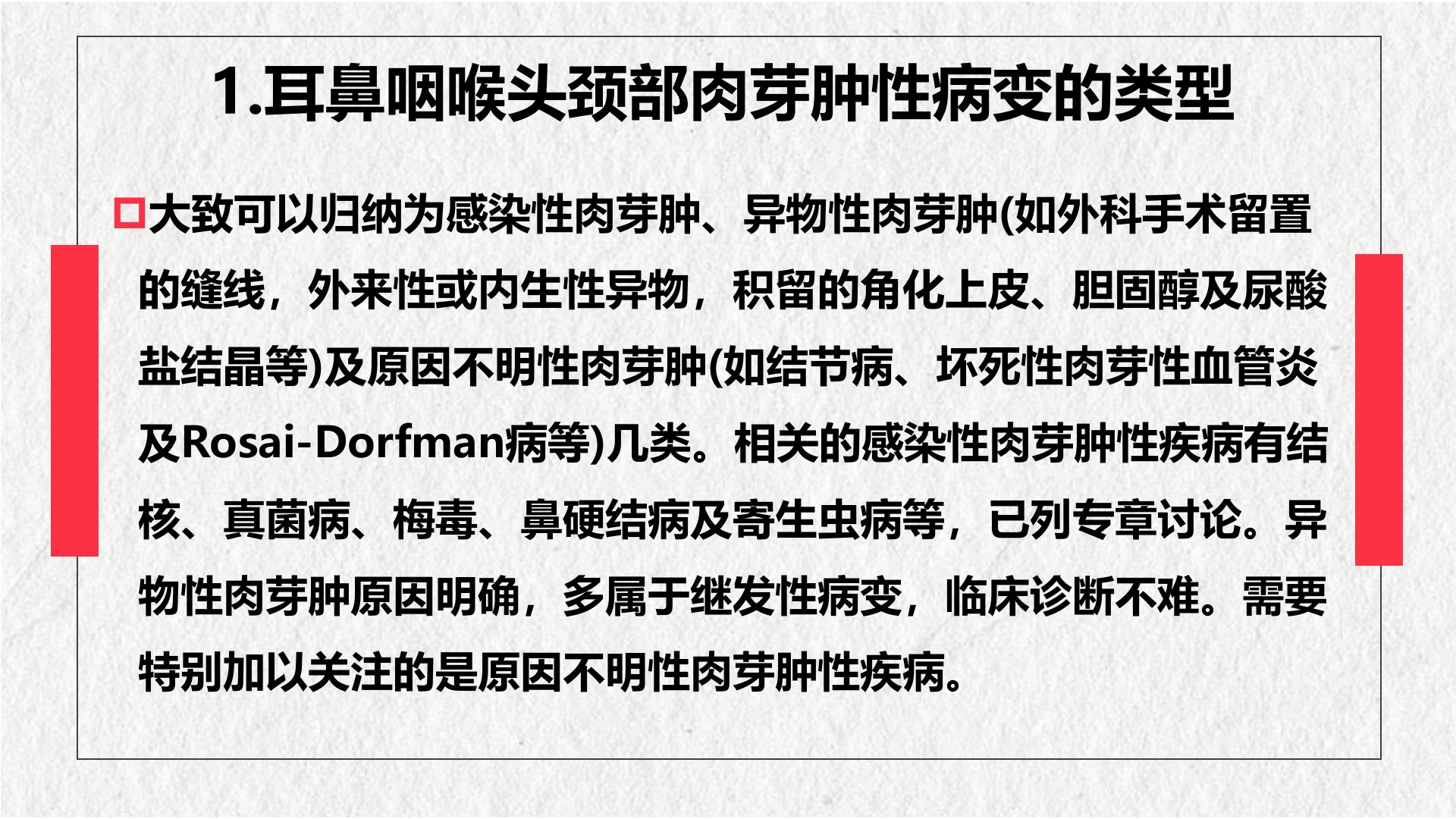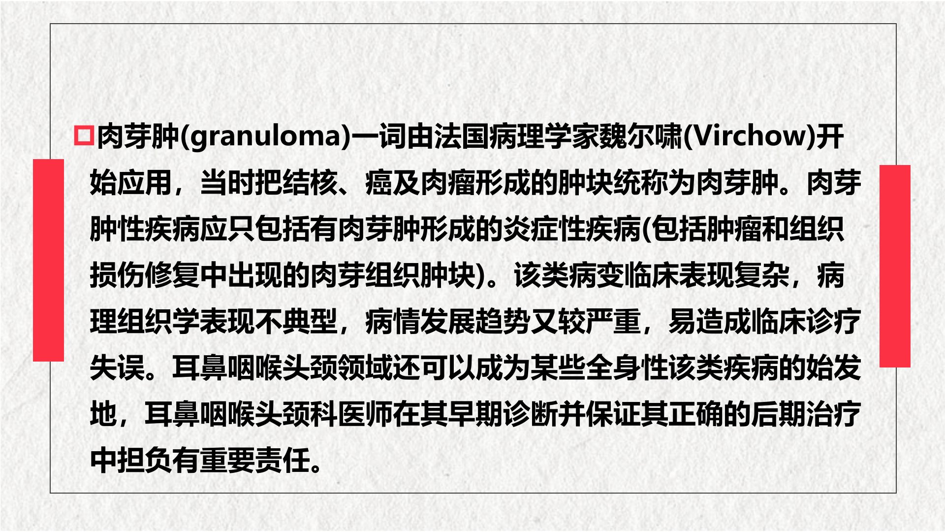 耳鼻咽喉头颈部常见肉芽肿性病变简介肉芽肿性疾病指有肉芽肿形成的炎症性疾病临床表现复杂病理组织学表现不典型病情发展趋势严重易造成诊疗失误。耳鼻咽喉头颈领域可成为某些全身性该类疾病的始发地耳鼻咽喉头颈科医师在其早期诊断并保证其正确的后期治疗中担负有重要责任。一、病变类型1感染性肉芽肿:如结核、真菌病等。2异物性肉芽肿:如外科手术留置的缝线等。3原因不明性肉芽肿:如结节病、坏死性肉芽性血管炎及RosaiDorfman病等。其中需特别关注的有:结外鼻型NKT细胞淋巴瘤:属于结外非霍奇金淋巴瘤典型病变常发生在鼻腔及面中线结构。易复发且对治疗不敏感预后多不良。坏死性肉芽肿性血管炎:自身免疫性小血管炎多发于中青年。典型表现为三联征即上呼吸道、肺脏和坏死性肾小球肾炎。朗格汉斯细胞组织细胞增生症:原因不明儿童多见。1985年国际组织细胞协会命名为“朗格汉斯细胞组织细胞增生症”。二、病变诊断鉴于该类病变的复杂性必须严格执行临床诊断基本原则实施专科诊查与多学科会诊相结合的诊疗模式。三、病变治疗在执行一般治疗原则的同时应切实贯彻专科治疗与多科协同治疗的现代综合治疗理念并结合中医药治疗充分发挥中西医结合治疗优势