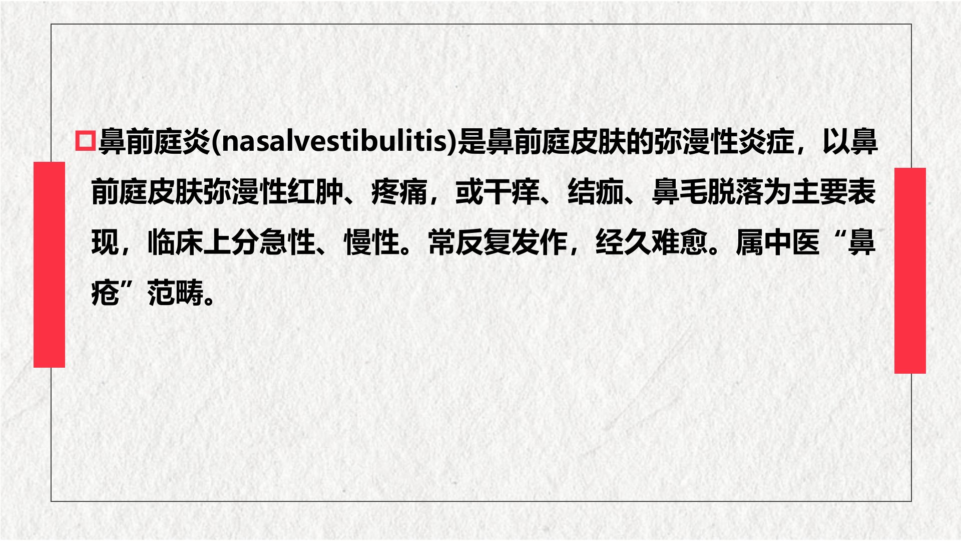 鼻前庭炎是鼻前庭皮肤的弥漫性炎症分急、慢性属中医“鼻疮”范畴常反复发作。【病因病理】常因急、慢性鼻炎和鼻窦炎等鼻腔疾病的分泌物刺激或有挖鼻等不良习惯损伤鼻前庭皮肤所致。糖尿病患者、长期接触有害气体及粉尘职业人员易诱发或加重本病。病理表现为鼻前庭或其上唇皮肤充血、表皮脱落、形成浅溃疡等。病机有邪热侵袭和阴虚血燥。【临床表现】急性者鼻前庭灼热、痒痛;慢性者作痒有干燥与异物感。体征为鼻前庭皮肤弥漫性红肿、皲裂、有脓痂黏附。【诊断与鉴别诊断】诊断要点包括鼻前庭灼热疼痛瘙痒干燥与异物感等;需与鼻前庭湿疹相鉴别。【治疗】以去除诱因、全身调理、加强局部治疗、预防继发性感染为原则。包括辨证论治和局部治疗必要时可用物理治疗。【预防与调护】需戒除挖鼻习惯忌搔抓患处保持局部清洁;积极治疗鼻腔疾患;忌食辛辣炙博肥甘厚味。