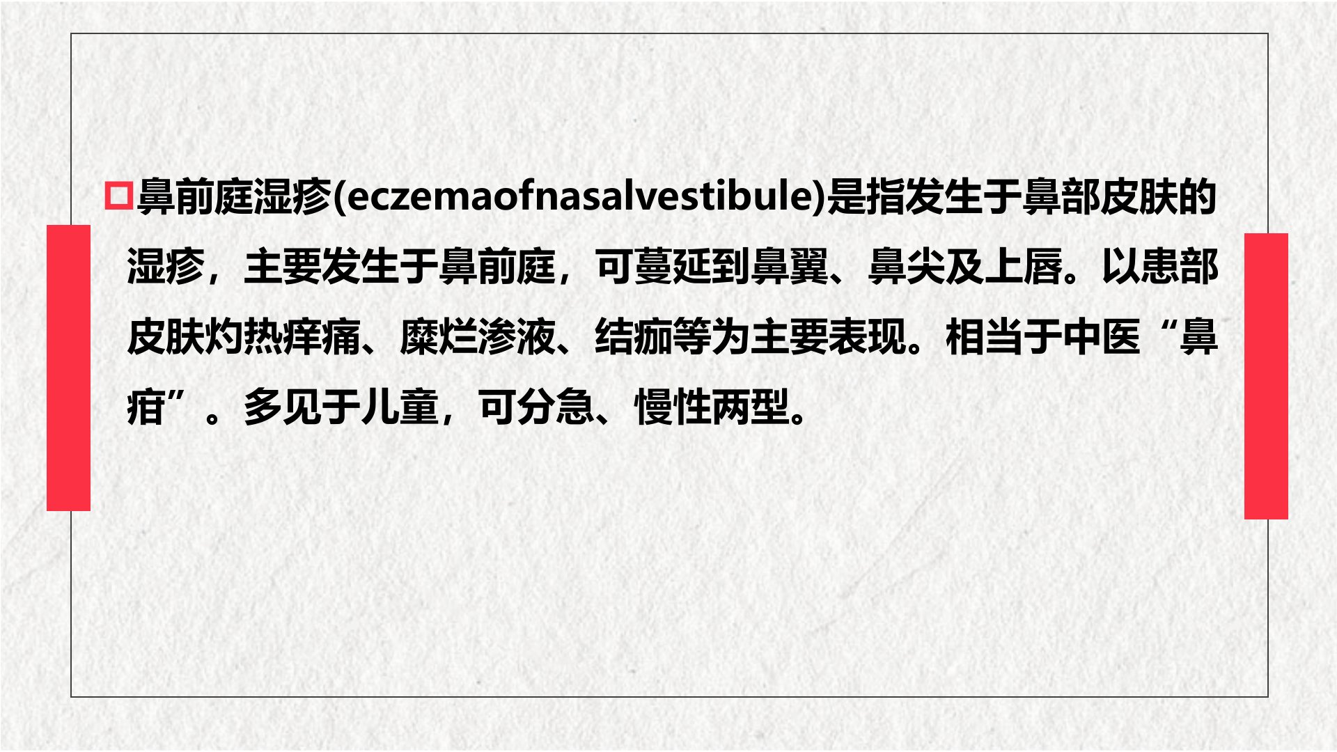 鼻前庭湿疹指发生于鼻部皮肤的湿疹多见于儿童分急、慢性两型相当于中医“鼻疳”。【病因病理】属皮肤变态反应性疾病可因接触致敏物质、鼻腔分泌物刺激及湿热环境影响而发病。病理上急性期可见角质层角化不全、水疱及细胞浸润等;亚急性期有角化不全、结痂及细胞内水肿;慢性期则表皮棘层肥厚、角化亢进及炎症浸润。【临床表现】患部瘙痒、疼痛继发感染则有胀痛或灼痛。局部可见潮红斑、水疱、糜烂面及痂片。慢性期患处肌肤增厚、粗糙、皲裂、结痂。【诊断与鉴别诊断】要点为患部皮肤多形性损害病程久且反复发作。需与鼻前庭炎相鉴别。【治疗】去除病因局部与全身治疗结合。中药以祛风清热燥湿止痒润燥为则酌情应用抗过敏药及抗生素。局部对症治疗选用清洁、止痒、抗菌、抗炎、收敛药物。【预防与调护】注意局部卫生积极治疗鼻病忌食辛辣及发物小儿注意饮食调养。
