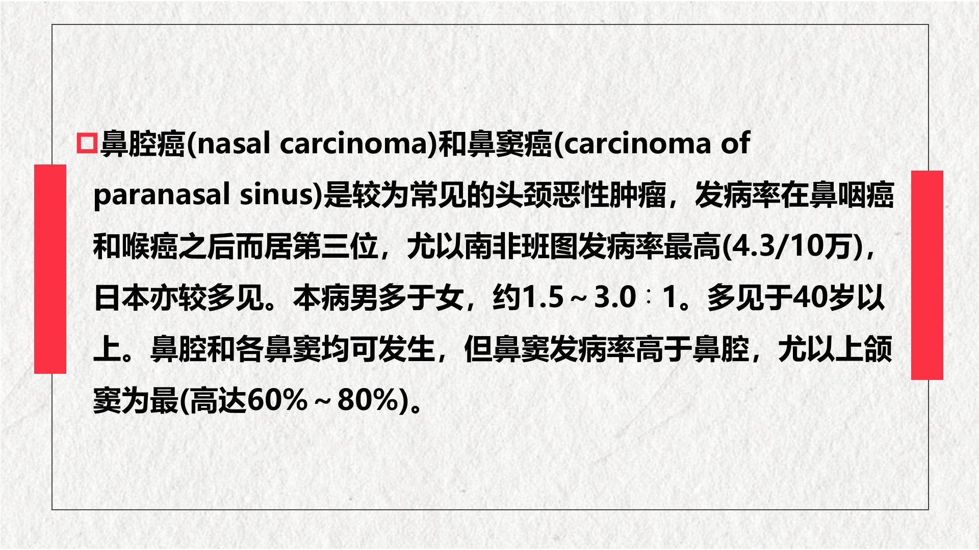 鼻腔与鼻窦恶性肿瘤鼻腔癌(nasalcarcinoma)和鼻窦癌(carcinomaofparanasalsinus)是较为常见的头颈恶性肿瘤,发病率在鼻咽癌和喉癌之后而居第三位,尤以南非班图发病率最高(4.3/10万),日本亦较多见。本病男多于女,约1.5~3.0∶1。多见于40岁以上。鼻腔和各鼻窦均可发生,但鼻窦发病率高于鼻腔,尤以上颌窦为最(高达60%~80%)。事实上,这类病人就诊时,其病变多已超过一个解剖部位,往往难以准确判断其原发部位而常常视为一体。一般而言,良性肿瘤多发于鼻腔,恶性肿瘤好发于鼻窦。中医典籍对这类恶性肿瘤未有专门论述,其相关症状描述散见于鼻渊、控脑砂、恶核等病证中。...