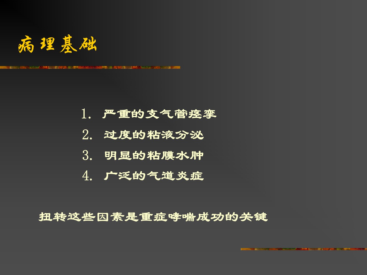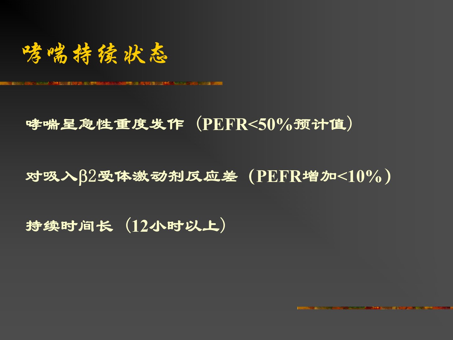哮喘持续状态是哮喘急性重度发作病理基础包括支气管痉挛、粘液分泌过多、粘膜水肿及气道炎症。诱发因素包括长期用受体激动剂未抗炎、吸入过敏物质、病毒感染、理化因子激发、脱水及并发症等。高危因素包括严重哮喘发作史、近期未使用吸入性糖皮质激素等。临床类型分为突发起病型和缓慢起病型。处理包括:一、病情评估通过临床表现、肺功能检查及血气分析判断病情严重程度;二、初始治疗吸入受体激动剂、吸氧、静脉用糖皮质激素保持呼吸道湿润控制感染禁用镇静药物;三、后续评估及处理根据病情分为中度、重度哮喘发作分别给予相应治疗。若1小时内反应良好可回家处理否则需住院或转ICU。机械通气用于吸入无效的危重患儿。婴儿喘息反复发作常见原因包括病毒感染、基础疾病等处理包括急性发作期和维持期治疗。