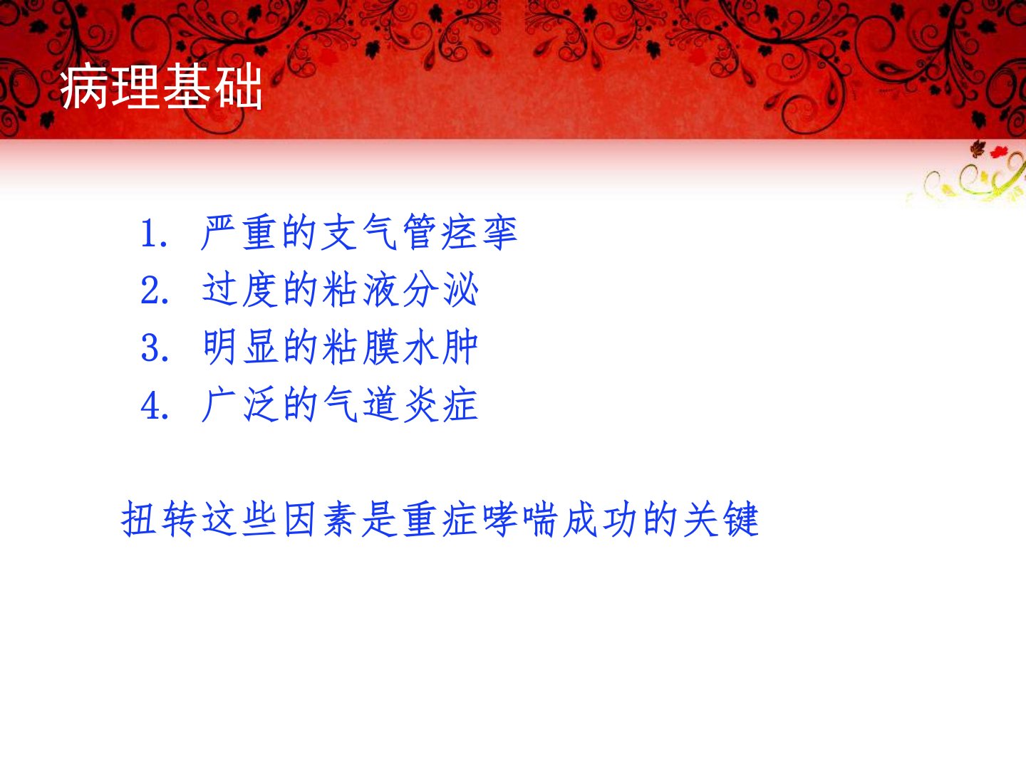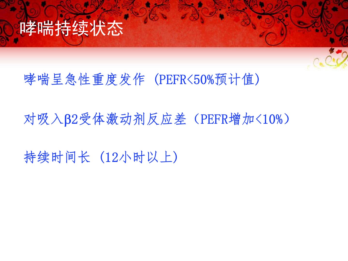 长兴县中医院倪美良医生介绍了哮喘持续状态的救治。哮喘持续状态表现为急性重度发作其病理基础包括严重的支气管痉挛、粘液分泌过度、粘膜水肿和广泛气道炎症。诱发因素有长期用受体激动剂未抗炎、吸入过敏物质、病毒感染等。高危因素包括有严重哮喘发作史、近期未用吸入性糖皮质激素等。临床类型分为突发起病型和缓慢起病型。临床表现提示哮喘严重时会有呼吸三凹症、奇脉等。治疗方面包括初始治疗如吸入受体激动剂、吸氧、静脉用糖皮质激素等以及根据病情分级进行的中度、重度哮喘发作处理。对于婴儿难治性喘息需处理常见原因如病毒感染、基础疾病并采取吸入药物、短期静脉用糖皮质激素等措施。