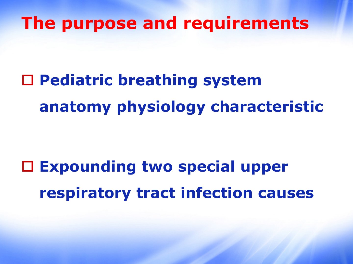 RespiratorydiseaseThepurposeandrequirementsPediatricbreathingsystemanatomyphysiologycharacteristicExpoundingtwospecialupperrespiratorytractinfectioncauses一、概述OverviewRespiratoryallergicdiseasesOnthelowerrespiratorytract,acuteandchronicinflammationdeformityRespiratoryforeignbodyPleuraldiseaseLungtumo...