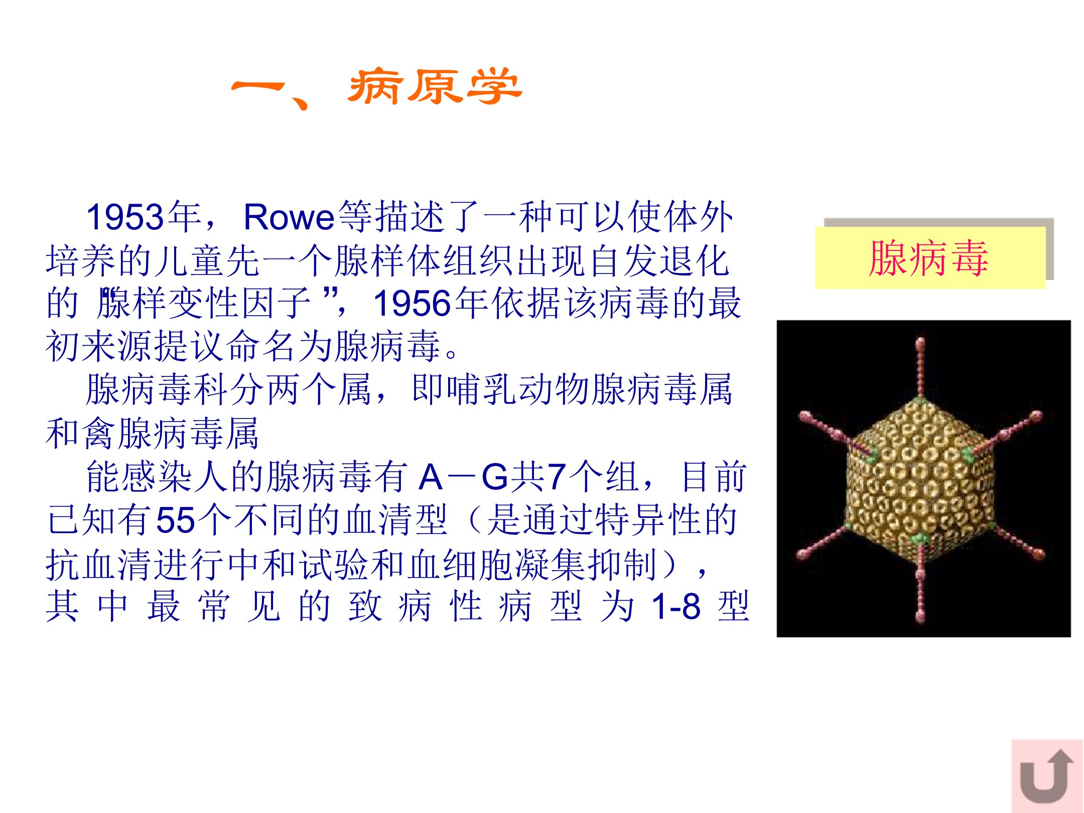 腺病毒感染与腺病毒肺炎内容?病原学?流行病学?病理?临床表现?辅助检查?治疗?后遗症期一、病原学腺病毒1953年,Rowe等描述了一种可以使体外培养的儿童先一个腺样体组织出现自发退化的“腺样变性因子”,1956年依据该病毒的最初来源提议命名为腺病毒。腺病毒科分两个属,即哺乳动物腺病毒属和禽腺病毒属能感染人的腺病毒有A-G共7个组,目前已知有55个不同的血清型(是通过特异性的抗血清进行中和试验和血细胞凝集抑制),其中最常见的致病性病型为1-8型?腺病毒为大的,无包膜,直径70-90nm的DNA病毒。?核衣壳呈规则的20面体结构,衣壳由252个壳粒组成,由240个六邻体和12个五邻体组成。六邻体、...