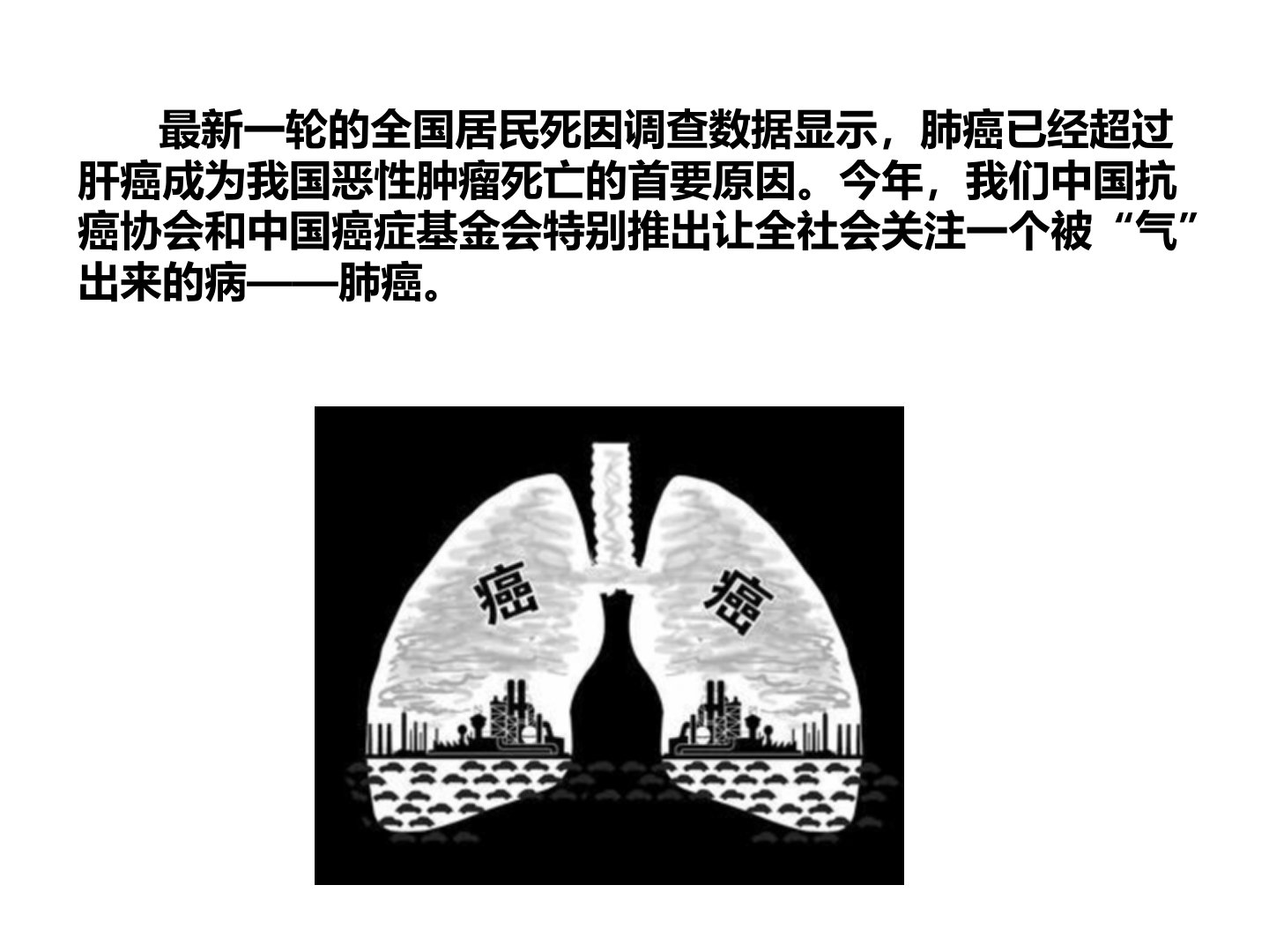 全国居民死因调查显示肺癌已成我国恶性肿瘤死亡首要原因。中国抗癌协会指出吸烟和“六化”(人口老龄化、城市现代化、农村城市化和工业化、环境污染化、生活方式不良化、医学现代化)是导致肺癌高发的主因。其中吸烟是重要因素中国有大量烟民且多人受二手烟、三手烟危害。“六化”中的环境污染化也威胁健康。预防肺癌需远离五“气”:室外大气污染PM25可进入肺泡组织增加肺癌风险;室内烟草烟气污染烟草中有多种致癌物二手烟、三手烟也有危害;厨房油烟污染高温烹调产生的油烟有害;装修装饰材料污染石材、漆料等可能释放致癌物;生闷气造成的“心理污染”负性事件长时间调整不好心态负面影响大。早期发现肺癌很重要胸部CT可发现5毫米以上早期肺癌之后要先确定是否恶性再治疗。