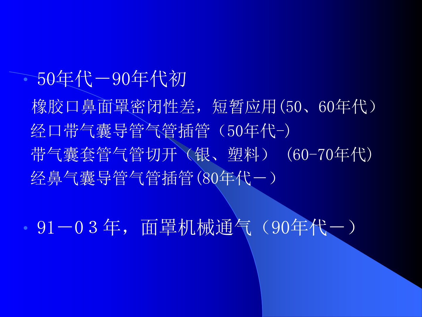 无创机械通气治疗呼吸衰竭的进展摘要无创机械通气治疗呼吸衰竭经历了从50年代到90年代初的逐步发展面罩材料从橡胶改进为硅胶具有适合国人面型、死腔小、密闭性好、依从性高等特点。面罩机械通气具备多种优势如实时跟踪呼吸流速、漏气补偿、依从性好等能改善换气功能维持呼吸道防御功能缩短机械通气和住院时间。其应用范围广泛包括预防呼吸衰竭、康复治疗以及治疗急性呼吸衰竭等。面罩机械通气操作顺序需规范先带面罩接呼吸机再调节参数至适合患者同时加强口腔护理。使用时需注意检查呼吸机运行、调换清洗滤膜、避免面罩漏气过多、支气管痉挛者需吸入支气管扩张剂等。通气方式不断优化如控制通气、辅助通气等呼吸机性能也逐步完善。针对COPD呼衰、危重哮喘、ARDS等不同病症面罩机械通气有特定的治疗策略和参数调节方法。未来面罩机械通气有望成为呼吸衰竭的一线治疗手段并走向社区和家庭。