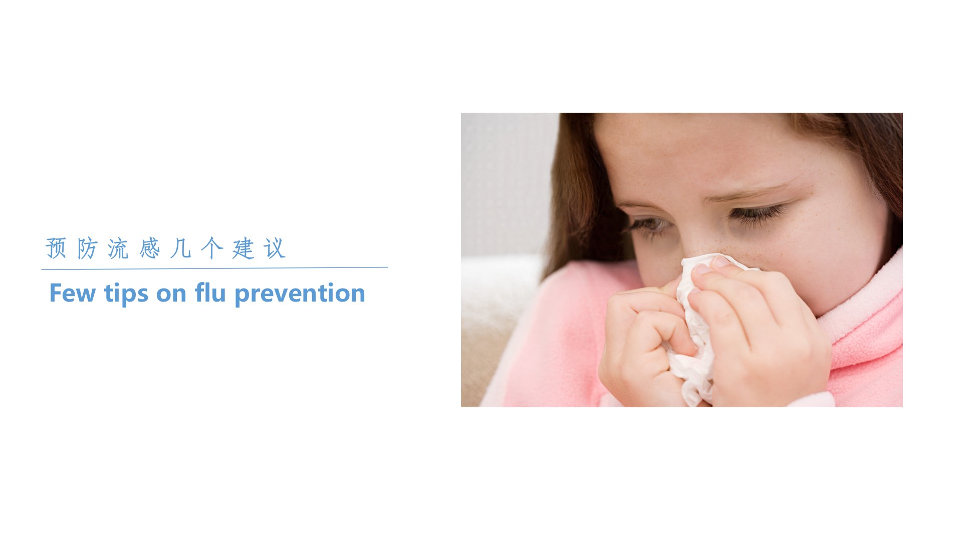 预防流感几个建议摘要预防流感可从多方面着手:1膳食平衡:遵循《黄帝内经》理念以谷物为主食水果、蔬菜和肉类为辅。2积极锻炼:适度运动避免大汗淋漓选适合自己的运动项目运动后及时补水保持计划性与持续性户外运动留意空气指数。3良好睡眠:注意保暖睡前不喝浓茶尽量11点前入睡保持愉悦心情可通过听音乐、冥想、运动减压。4充足饮水:别等渴了才喝两餐间适量饮水隔一小时一杯;水含口中缓缓喝下;喝2530的温开水;喝新鲜开水不喝久置水。5讲究卫生:勤洗手用流动水且洗30秒以上烘干或纸巾擦干;勤开窗通风;身体不适及时就医就医可参考就医快线(httphylzjolcomcn)。