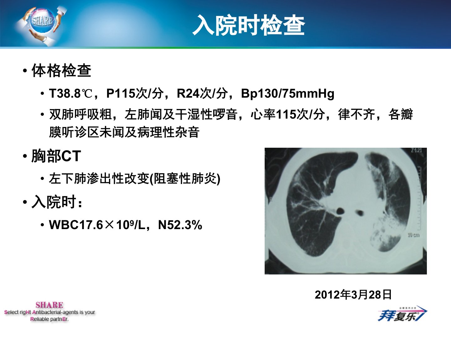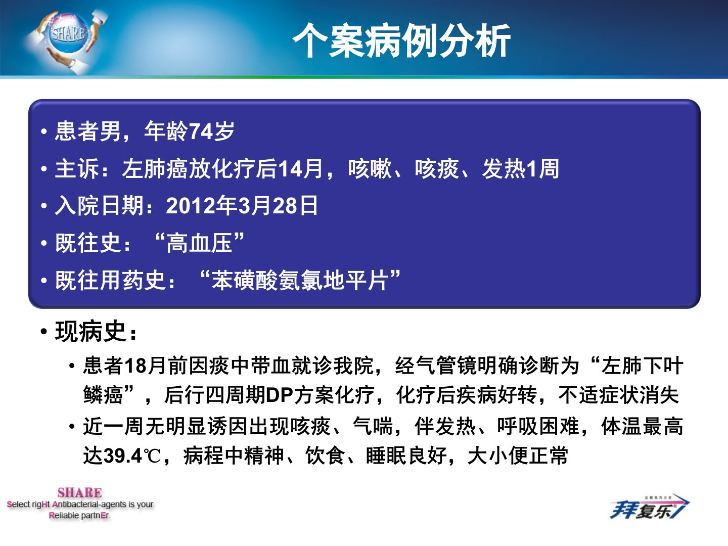 新疆肿瘤医院肺内二科李晓琴报告一例AECOPD个案:患者18月前确诊左肺下叶鳞癌经四周期DP方案化疗后好转。近一周出现咳痰、气喘、发热、呼吸困难体温最高达394入院诊断为左肺下叶鳞癌、慢性阻塞性肺炎、高血压病3级。COPD是美国第四大致死疾病在我国也严重危害健康。AECOPD病因80为感染因素细菌感染占4060。近年来细菌感染在AECOPD中的作用存在争议但通过保护性标本刷、支气管肺泡灌洗等新技术验证了其作用。莫西沙星对AECOPD常见致病菌具有较高的细菌学清除率较对照组平均快13天缓解症状且在呼吸道具有很高的药物浓度老年、肾功能障碍或轻中度肝功能损害的患者无需调整用药剂量安全性好。综上推荐莫西沙星作为初始经验性治疗AECOPD的一线药物。