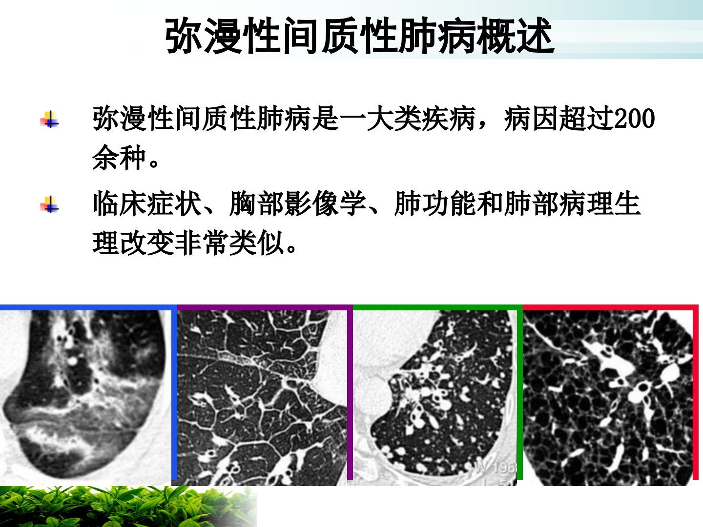 弥漫性间质性肺病的诊治思路摘要弥漫性间质性肺病(DPLDILD)病因复杂超过200种涉及环境、职业、药物、感染、心脏疾病、肾功能不全、移植物排异反应、遗传等多个方面。肺间质由肺泡壁、网状和弹性纤维结缔组织、毛细血管网及淋巴管等组成与肺泡上皮和肺泡腔构成的肺实质共同影响肺功能。已知病因中环境职业相关ILD包括无机和有机粉尘暴露;药物相关ILD涉及抗生素、心血管药、抗肿瘤药等;感染相关ILD涵盖血型播散性肺结核、病毒性肺炎等。此外还有特发性间质性肺炎(IIP)包括特发性肺间质纤维化(IPF)、非特异性间质性肺炎(NSIP)等。诊断DPLDILD需综合病史、体格检查、血清化验、HRCT、支气管镜BALF和TBLB、肺功能及有创肺活检。从病因角度需考虑吸入、肉芽肿疾病、感染、CTD(血管炎)、其他系统疾病及呼吸系统独立疾病。影像学上不同病因呈现不同特征如磨玻璃影、网格影、结节影等。诊断是一个动态随访的过程若病因仍难以明确可适宜选择有创操作。
