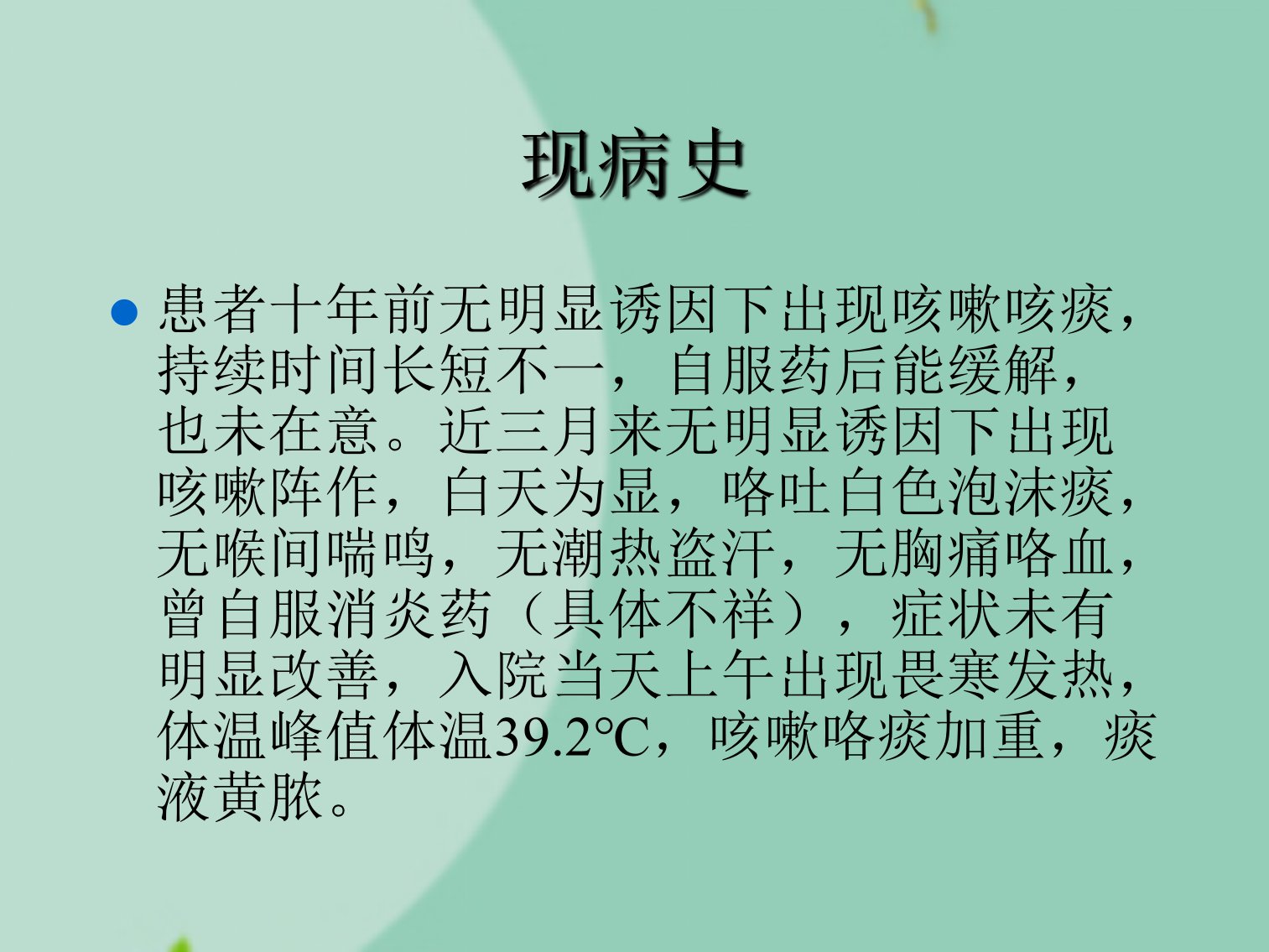患者十年前出现咳嗽咳痰自服药可缓解未予重视。近三月症状加重自服消炎药未改善入院当天畏寒发热咳嗽咯痰加重。患者否认麻疹、肺炎等病史有未正规诊治的鼻炎史。体格检查显示患者体温39脉搏90次分呼吸18次分血压12880mmHg双肺呼吸音粗两下肺可及散在湿啰音。实验室检查显示白细胞和中性粒细胞增高C反应蛋白升高冷凝集试验阳性。影像学检查示左下肺感染性病变两下肺支气管扩张伴感染考虑DPB右侧上颌窦炎。患者经阿奇霉素等药物治疗后症状明显好转出院后继续治疗复查胸部CT示病灶吸收好转。DPB是弥漫存在于两肺呼吸性细支气管的气道慢性炎症性疾病突出的临床表现是咳嗽、咳痰和活动后气促严重者可导致呼吸功能障碍。DPB病因尚不清楚可能与感染、遗传、免疫异常、刺激性有害气体吸入与大气污染有关。DPB特征是以两肺呼吸性细支气管区域的慢性炎症为特征可导致严重的呼吸功能障碍。DPB治疗首选红霉素用量为每日400600mg初期病人原则上需用药6个月以上进展期病人则需持续用药2年以上。DPB预后较好5年生存率上升年病死率下降。