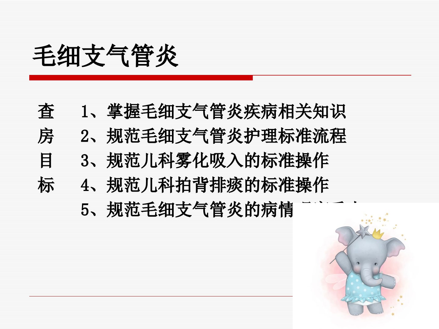 毛细支气管炎护理毛细支气管炎查1、掌握毛细支气管炎疾病相关知识房2、规范毛细支气管炎护理标准流程目3、规范儿科雾化吸入的标准操作标4、规范儿科拍背排痰的标准操作5、规范毛细支气管炎的病情观察重点概述毛细支气管炎是婴幼儿时期由呼吸道合胞病毒等多种病毒感染引起的,病变主要累及毛细支气管,临床以骤发喘憋和阻塞性肺气肿为特征的下呼吸道感染性疾病。发病季节:我国北方多发生于冬季和初春,广东、广西则以春夏或夏秋为多好发年龄:主要是2岁以内婴儿,发病高峰年龄为2-6个月,80%以上在1岁以内。发病率男女相似,但男婴重症较多病原学呼吸道合胞病毒是常见的病原体,占50%以上副流感病毒、流感病毒、人类偏肺病毒、腺...