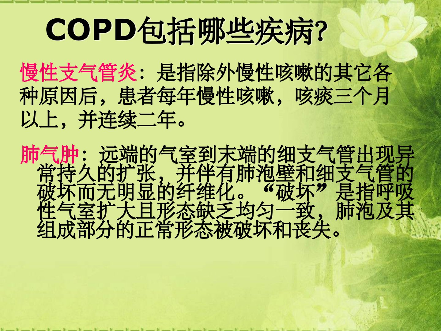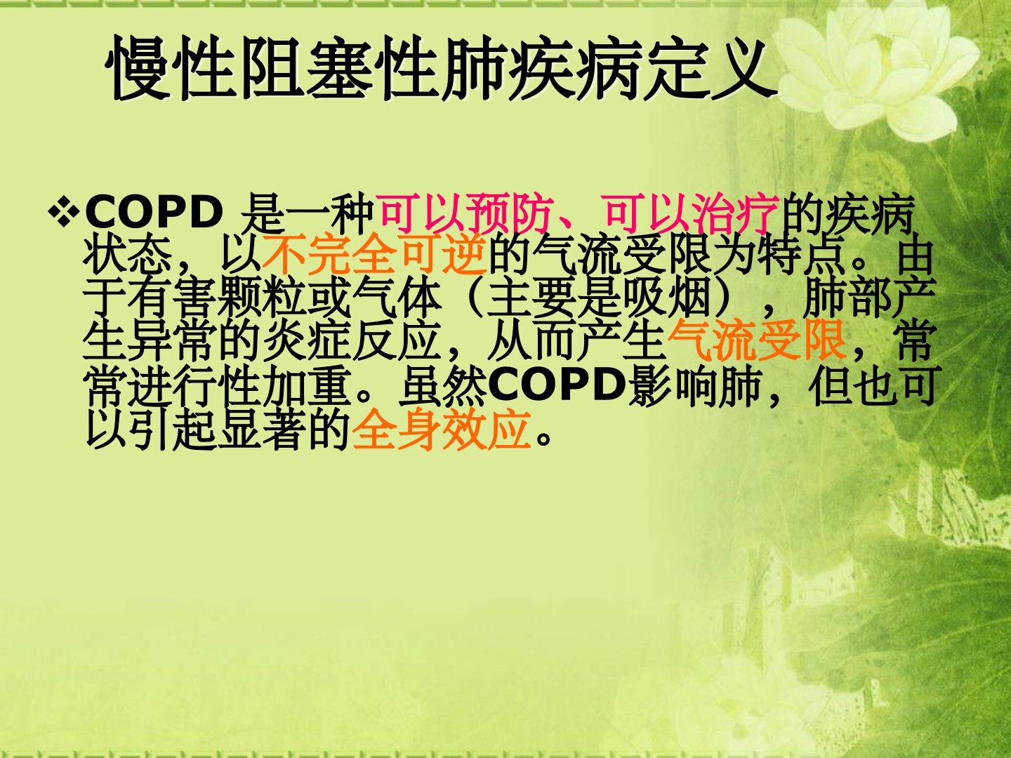 慢性阻塞性肺疾病的家庭氧疗慢性阻塞性肺疾病定义COPD是一种可以预防、可以治疗的疾病状态,以不完全可逆的气流受限为特点。由于有害颗粒或气体(主要是吸烟),肺部产生异常的炎症反应,从而产生气流受限,常常进行性加重。虽然COPD影响肺,但也可以引起显著的全身效应。COPD包括哪些疾病?慢性支气管炎:是指除外慢性咳嗽的其它各种原因后,患者每年慢性咳嗽,咳痰三个月以上,并连续二年。肺气肿:远端的气室到末端的细支气管出现异常持久的扩张,并伴有肺泡壁和细支气管的破坏而无明显的纤维化。“破坏”是指呼吸性气室扩大且形态缺乏均匀一致,肺泡及其组成部分的正常形态被破坏和丧失。COPD的病因(一)个体因素1.遗传因...