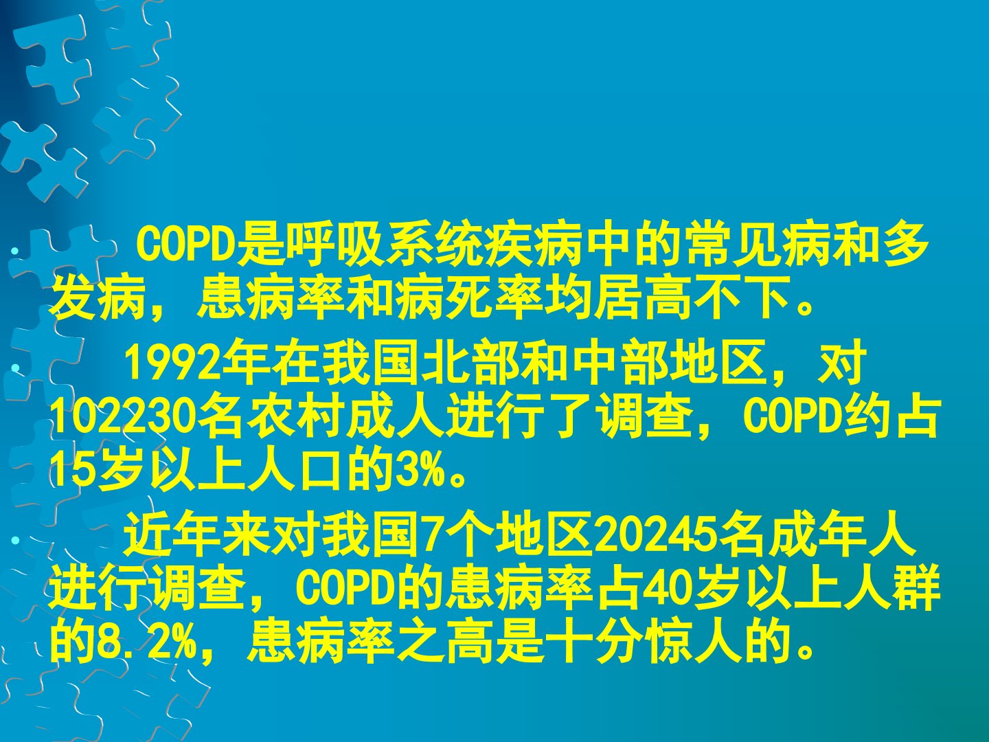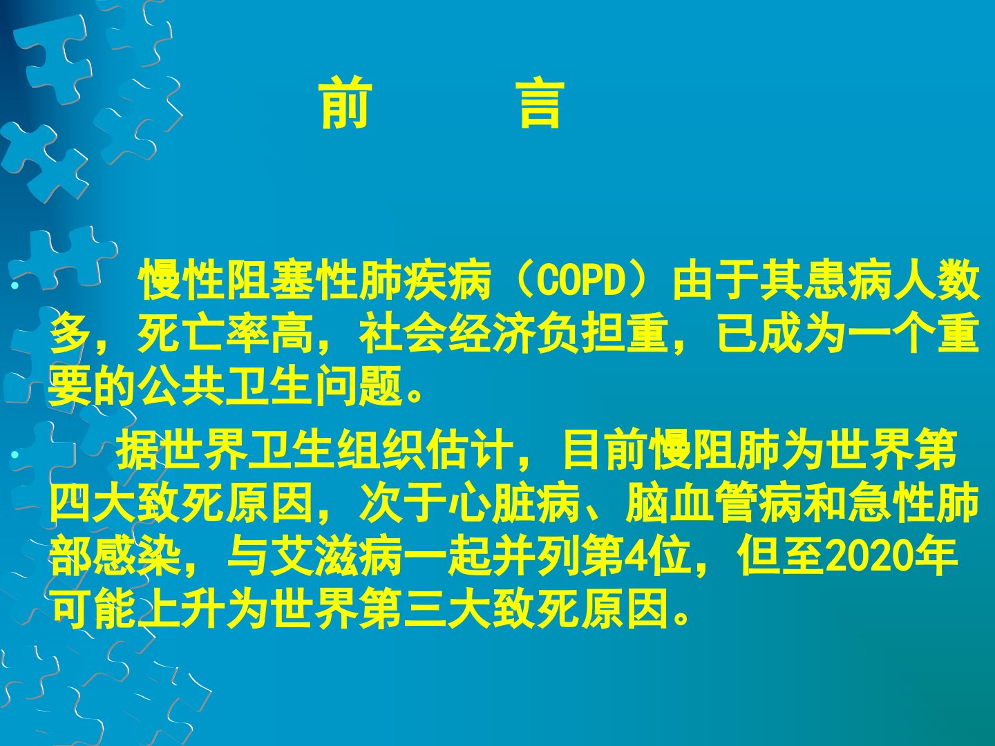 慢性阻塞性肺疾病chronicobstructivepulmonarydisease,COPD前言慢性阻塞性肺疾病(COPD)由于其患病人数多,死亡率高,社会经济负担重,已成为一个重要的公共卫生问题。据世界卫生组织估计,目前慢阻肺为世界第四大致死原因,次于心脏病、脑血管病和急性肺部感染,与艾滋病一起并列第4位,但至2020年可能上升为世界第三大致死原因。COPD是呼吸系统疾病中的常见病和多发病,患病率和病死率均居高不下。1992年在我国北部和中部地区,对102230名农村成人进行了调查,COPD约占15岁以上人口的3%。近年来对我国7个地区20245名成年人进行调查,COPD的患病率占40岁以...