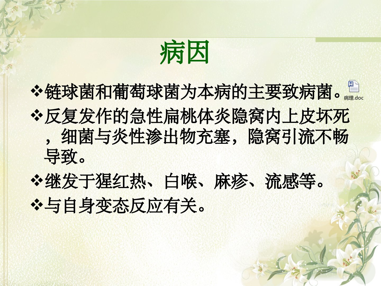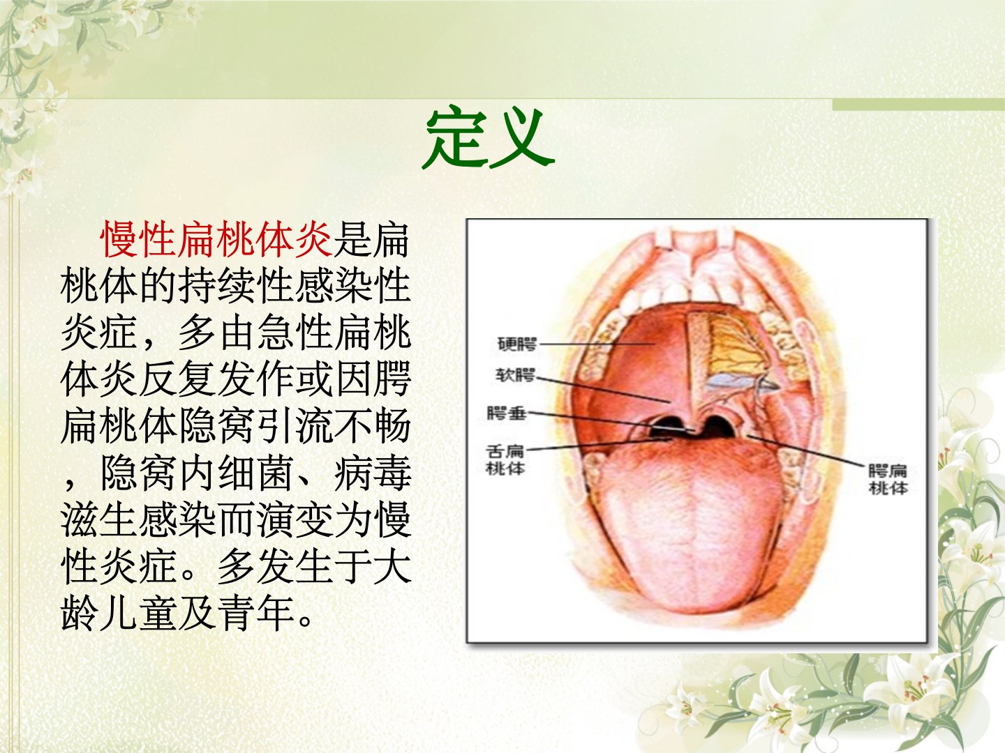 慢性扁桃体炎摘要慢性扁桃体炎是扁桃体的持续性感染性炎症多由急性扁桃体炎反复发作或因隐窝引流不畅所致多见于大龄儿童及青年主要致病菌为链球菌和葡萄球菌病理分型有增生型、纤维型、隐窝型。护理评估包括健康史、身体状况、辅助检查、心理社会状况。治疗要点:非手术治疗需长期坚持保持口腔清洁含漱法、淡盐水漱口长期服维生素C体质虚弱者用提高免疫力制剂非急性发作不滥用消炎药;手术治疗有适应症与禁忌症;中医认为与体质虚弱脏腑虚损有关多用滋补肺肾生津利咽方法。常见护理诊断有急性疼痛、体温过高、焦虑等。护理措施含一般护理、术前术后护理。健康教育要强身体锻炼、注意休息、保持口腔卫生等。护理评价显示患者焦虑、舒适度、睡眠改善对病情了解配合治疗疼痛缓解无并发症。此外还提供了相关练习题。