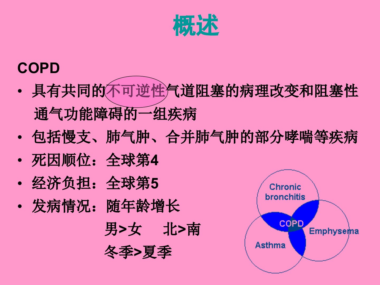 呼吸内科胡燕芳医生进行了慢性阻塞性肺疾病(COPD)查房相关讲解。COPD包括慢支、肺气肿等疾病死因顺位全球第4经济负担全球第5随年龄增长发病率上升病因包括吸烟、感染、空气污染等内外因素。其病理改变为支气管黏膜受损、肺气肿临床表现有桶状胸、呼吸音减弱等。实验室检查中肺功能检查是COPD诊断、严重程度、预后、疗效评价的主要指标X线可见肺纹理增粗CT用于鉴别诊断动脉血气可判断呼吸衰竭血液、痰液检查可判断有无感染、指导用药。诊断依据包括高危因素、临床症状体征、肺功能检查分型包括急性加重期和稳定期。稳定期治疗包括戒烟、脱离污染环境、药物治疗和非药物治疗;急性加重期治疗包括确定病因、决定治疗场所、使用支气管舒张剂、控制性吸氧、使用抗生素和糖皮质激素等。护理诊断包括气体交换受损、清理呼吸道无效、感染、睡眠形态紊乱、营养失调等并给出了相应护理措施。健康指导包括呼吸训练、运动训练、吸氧治疗及日常生活指导等。