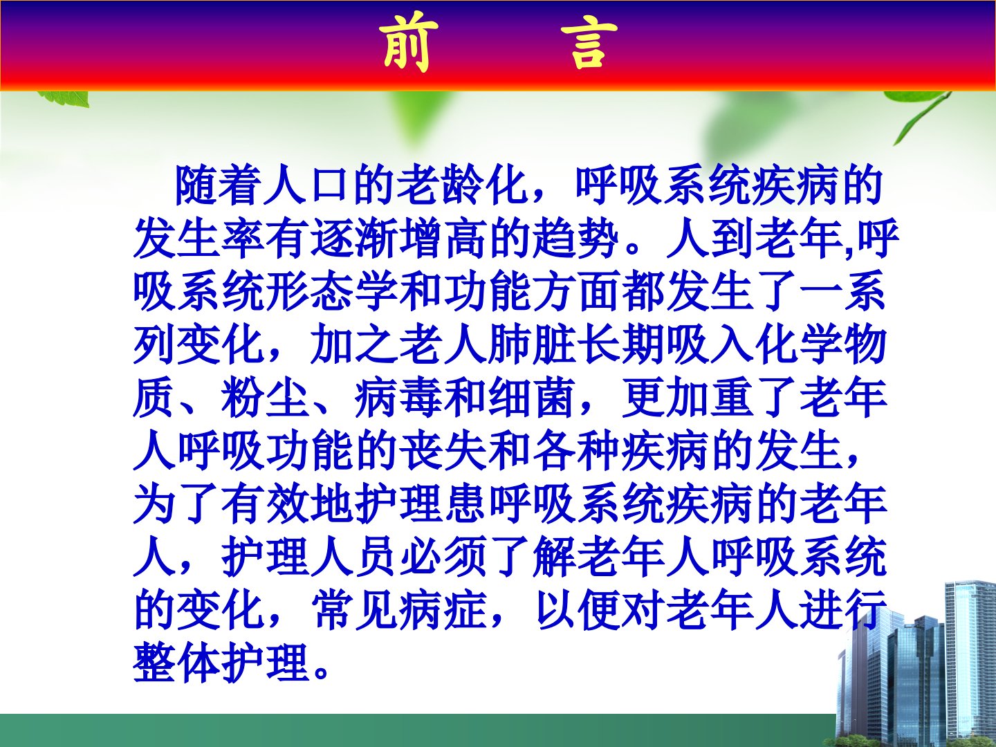 县人民医院内四科胡医生介绍了老年呼吸系统疾病护理新进展。随着老龄化呼吸系统疾病发生率上升老年人呼吸系统形态与功能变化加之长期吸入有害物质加重了呼吸功能丧失与疾病发生。为有效护理医护人员需了解老年呼吸系统变化及常见病症。老年慢性阻塞性肺病(COPD)是老年人最常见的呼吸系统疾病护理需评估患者意识、呼吸状况等并采取综合护理措施包括鼻导管持续低流量吸氧、有效排痰(有效咳嗽、胸部叩击、雾化疗法)、药物治疗(抗生素、支气管舒张剂等)、饮食护理(清淡易消化、高蛋白高维生素食物)及疾病知识指导。同时强调戒烟重要性提供戒烟方法。对于老年慢性支气管哮喘护理需提供安静舒适环境避免致敏原进行氧疗、药物护理、饮食指导及自我应急处理教育指导患者识别哮喘发作先兆学会简单紧急处理有效控制诱发因素。