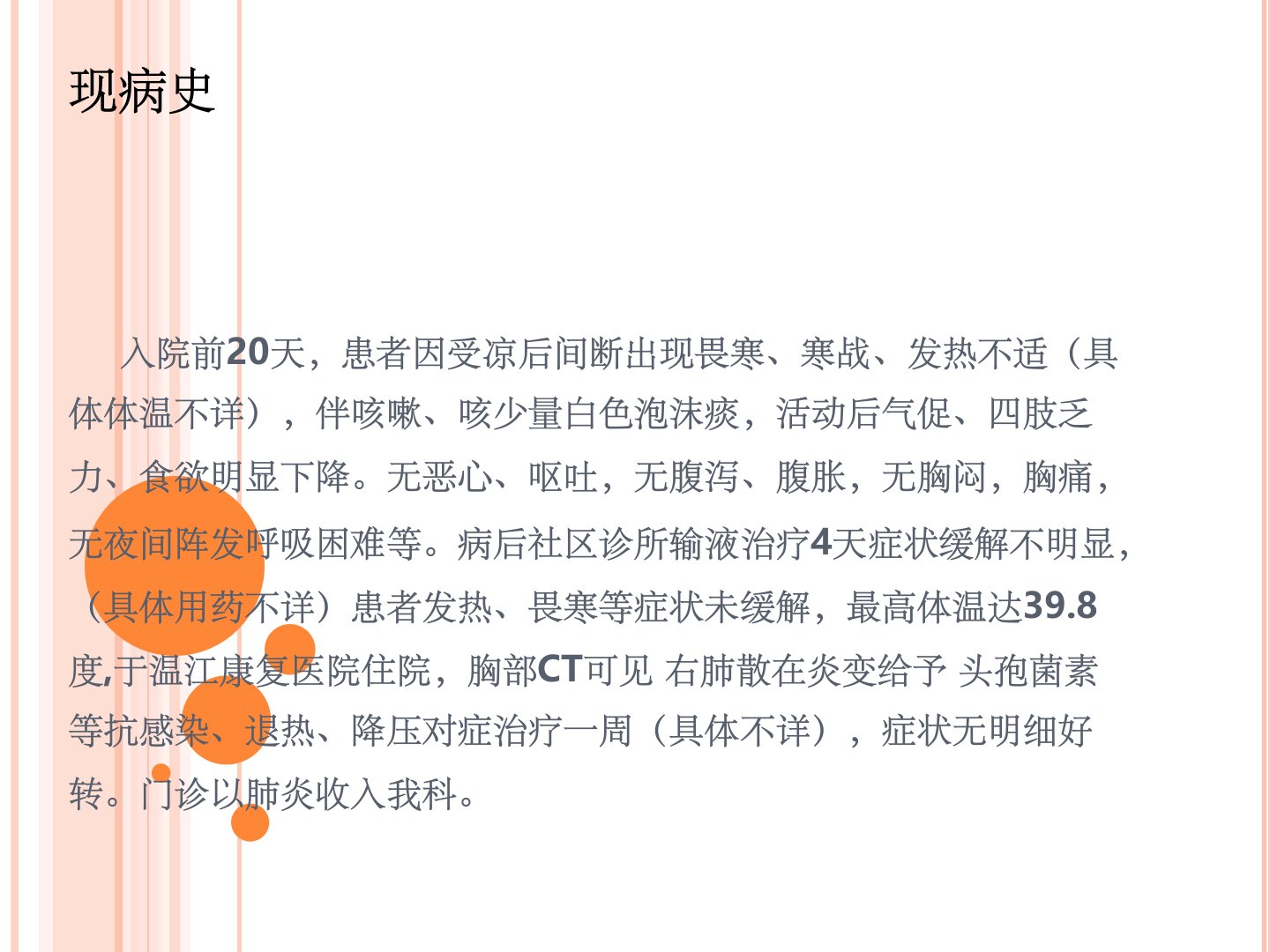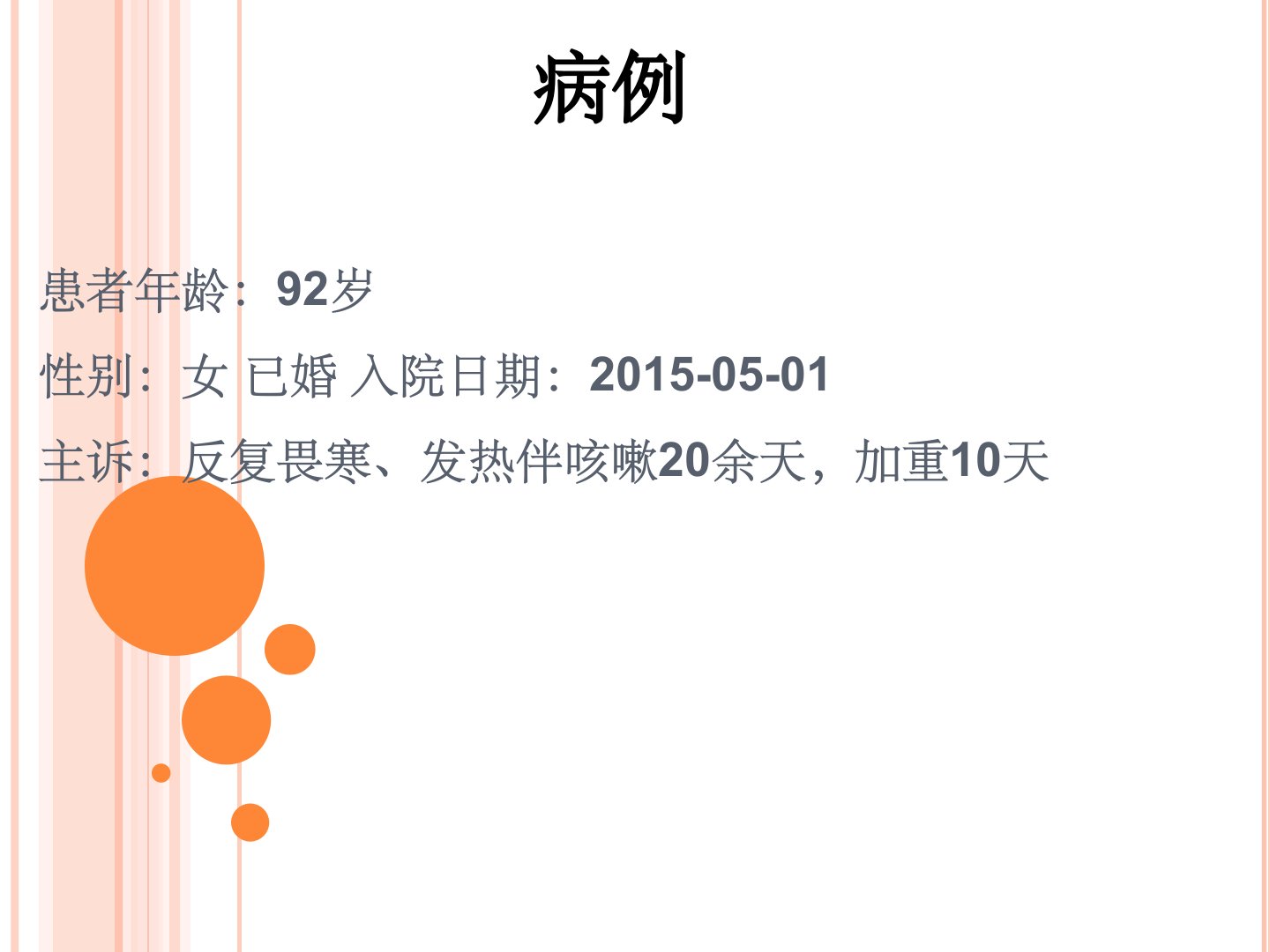 92岁女性患者因反复畏寒、发热伴咳嗽20余天加重10天入院既往有慢性阻塞性肺疾病等病史。患者受凉后出现症状社区诊所输液治疗4天症状无缓解后于温江康复医院住院胸部CT显示右肺散在炎变经头孢菌素等治疗一周无好转遂转入我科。查体见急性面容双肺呼吸音低闻及少许湿罗音。辅助检查示CRP、白细胞计数等显著升高血气分析异常。初步诊断为肺炎、脓毒血症等。治疗计划包括持续氧气吸入、心电监测、美罗培南抗感染等。治疗期间患者体温正常后再次发热考虑药物未覆盖致病菌、特殊病原体感染、并发症或诊断有误等原因后换用莫西沙星序贯治疗疗效显著。总结案例可见老年CAP院外口服青霉素头孢类抗生素效果差且肺炎发病率和死亡率随年龄增长而上升老年肺炎多发生于基础疾病之上易误诊和漏诊本例遵循指南建议选择最适合患者的个体化治疗方案。