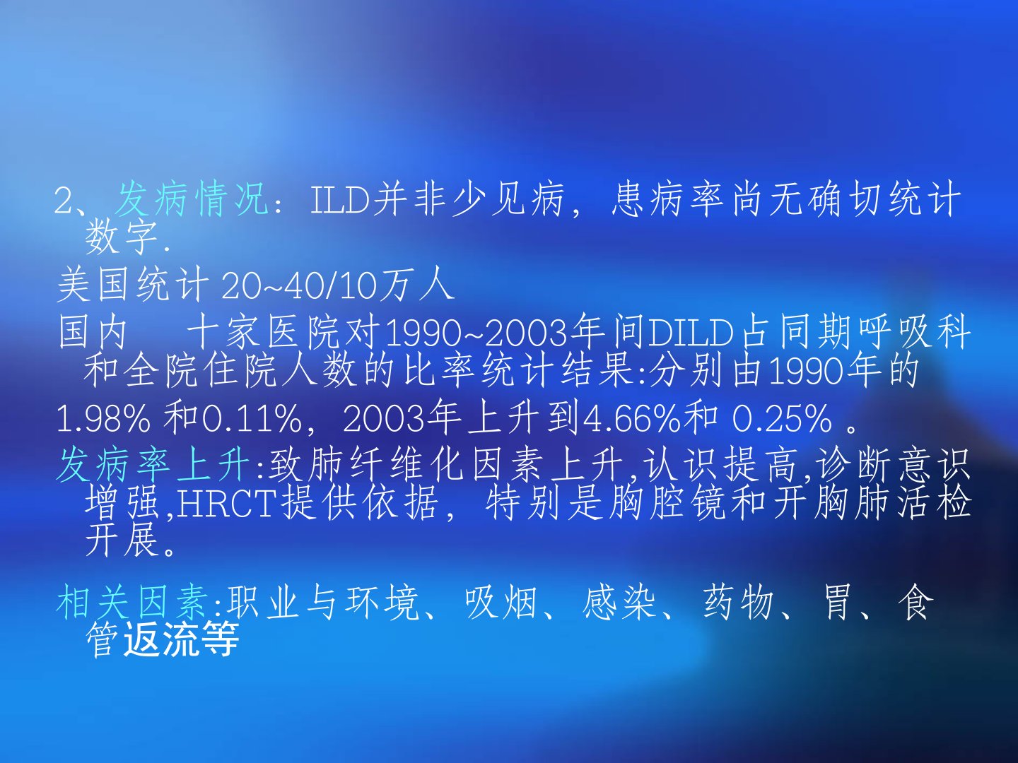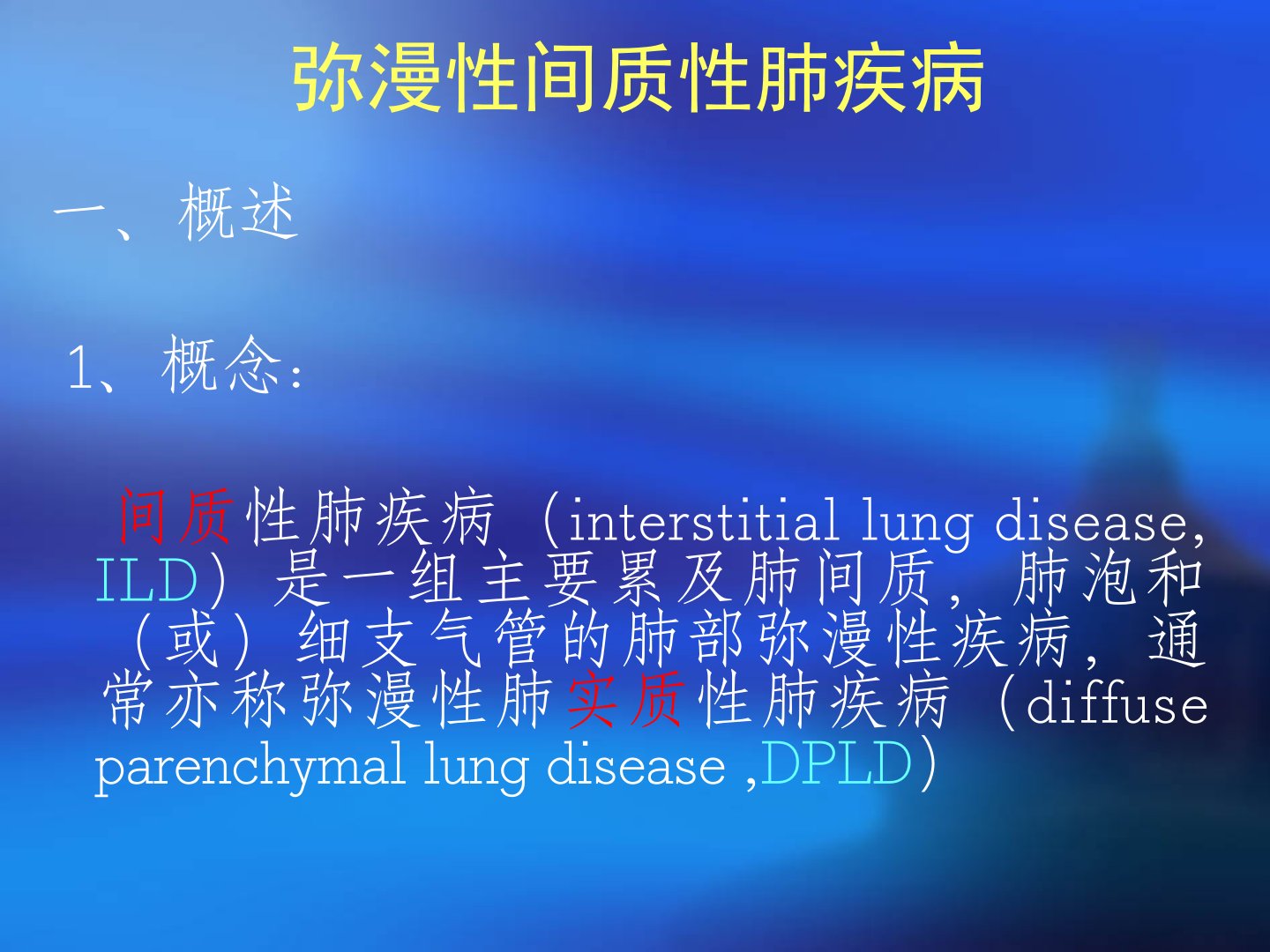 弥漫性间质性肺疾病吉林大学第一医院呼吸科徐建国弥漫性间质性肺疾病一、概述1、概念:间质性肺疾病(interstitiallungdisease,ILD)是一组主要累及肺间质,肺泡和(或)细支气管的肺部弥漫性疾病,通常亦称弥漫性肺实质性肺疾病(diffuseparenchymallungdisease,DPLD)2、发病情况:ILD并非少见病,患病率尚无确切统计数字.美国统计20~40/10万人国内十家医院对1990~2003年间DILD占同期呼吸科和全院住院人数的比率统计结果:分别由1990年的1.98%和0.11%,2003年上升到4.66%和0.25%。发病率上升:致肺纤维化因素上升,认识...