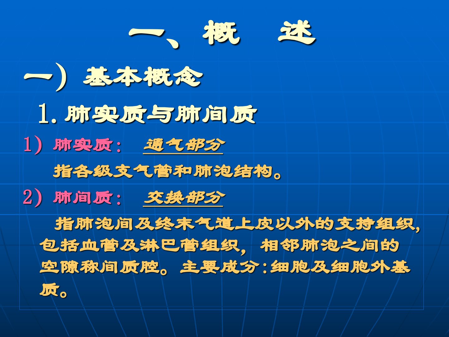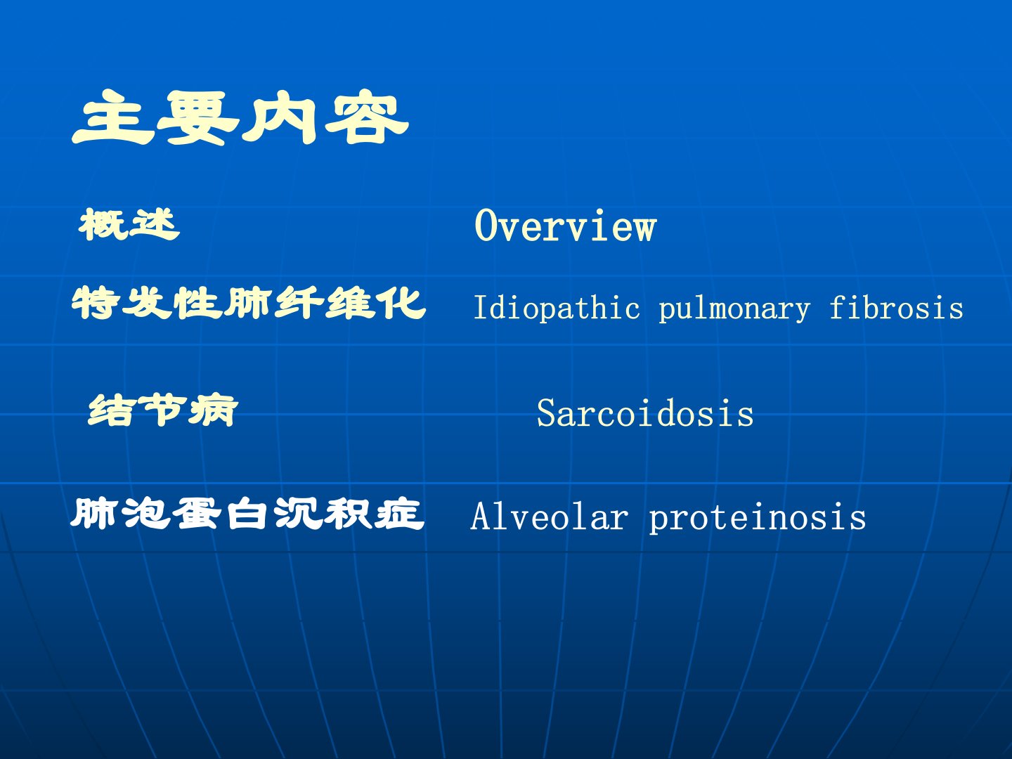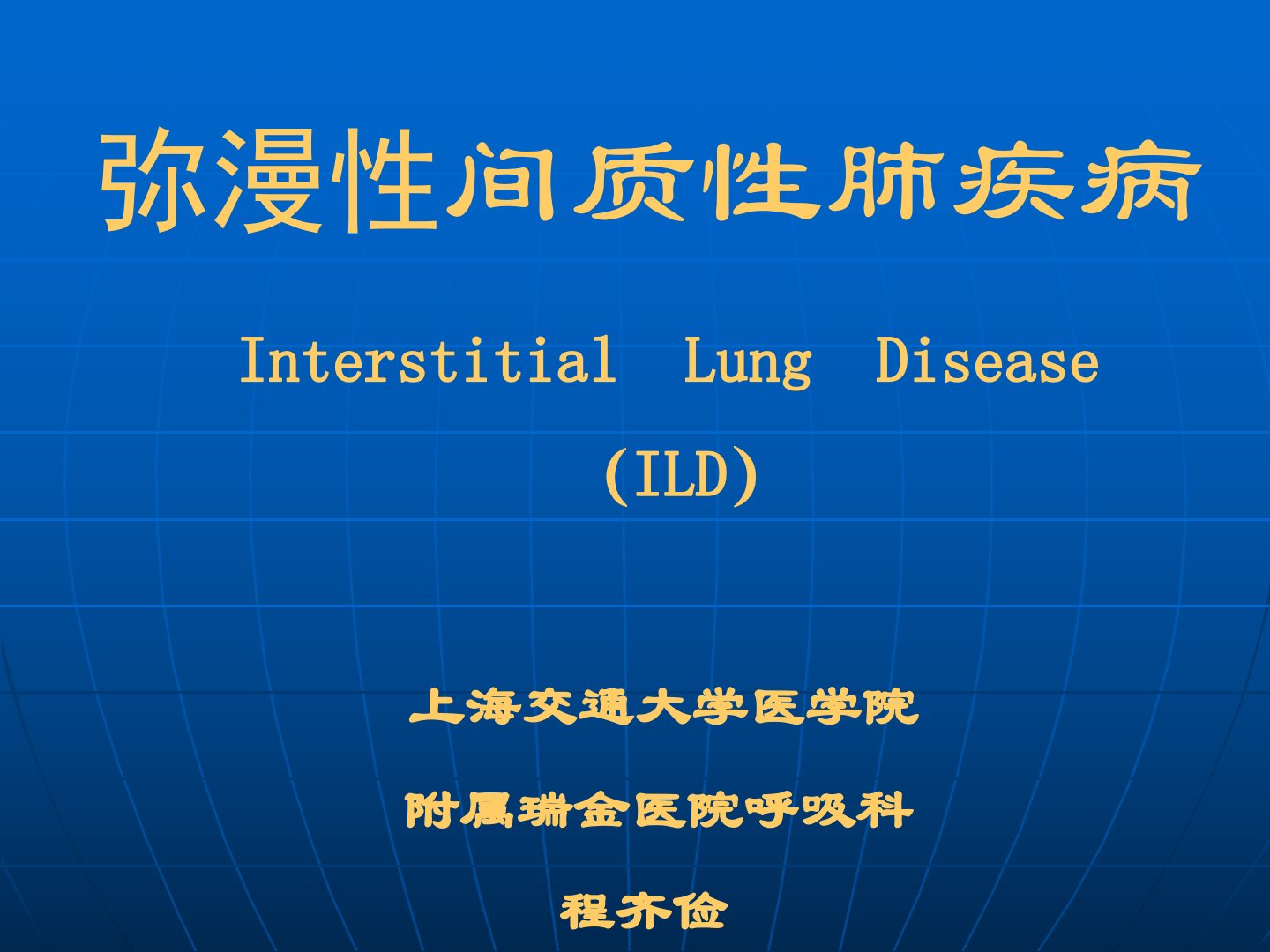弥漫性间质性肺疾病InterstitialLungDisease(ILD)上海交通大学医学院附属瑞金医院呼吸科程齐俭概述Overview特发性肺纤维化Idiopathicpulmonaryfibrosis肺泡蛋白沉积症Alveolarproteinosis主要内容结节病Sarcoidosis一、概述一)基本概念1.肺实质与肺间质1)肺实质:通气部分指各级支气管和肺泡结构。2)肺间质:交换部分指肺泡间及终末气道上皮以外的支持组织,包括血管及淋巴管组织,相邻肺泡之间的空隙称间质腔。主要成分:细胞及细胞外基质。肺间质细胞成分细胞外基质间叶细胞(结构细胞):成纤维细胞、平滑肌细胞及血管周细胞等。炎症及...