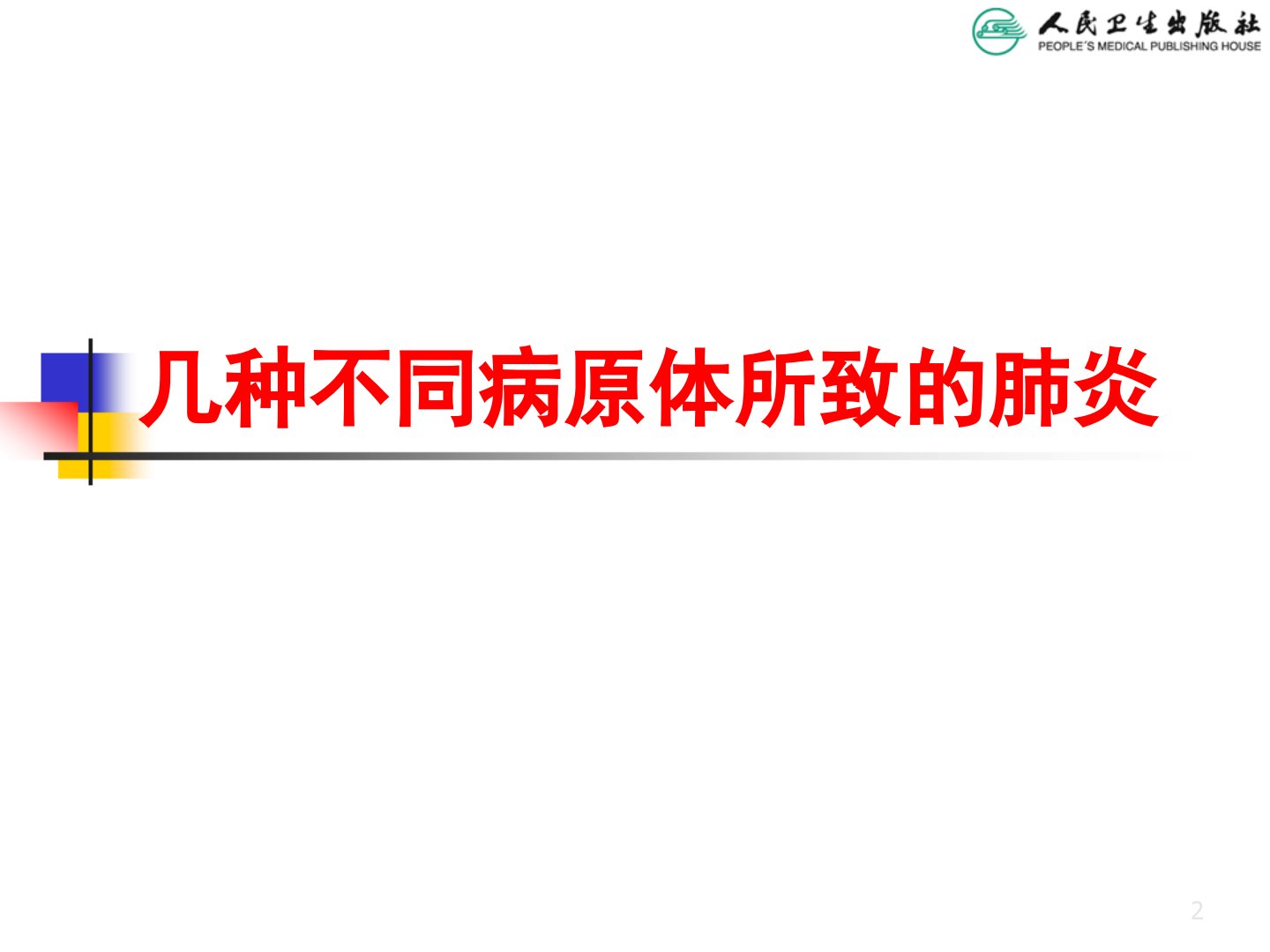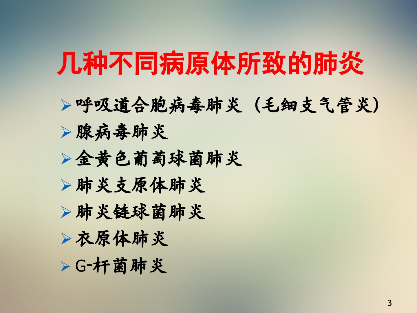 本文介绍了不同病原体所致肺炎的临床特点、诊断、治疗等内容。呼吸道合胞病毒肺炎以2岁内幼儿多见尤以6个月内婴儿为主冬春季高发以喘息为主伴低热、咳嗽等症状胸片示梗阻肺气肿等治疗以保持呼吸道通畅、抗病毒等为主。腺病毒肺炎2岁以下多见起病急、中毒症状重持续高热易合并细菌感染遗留慢性肺炎等后遗症胸片改变早于罗音出现。金黄色葡萄球菌肺炎起病急、进展快新生儿、婴幼儿多见弛张高热中毒貌明显胸片特点多变、多形、多发、存在长治疗宜早、足量、足程用抗生素。支原体肺炎青少年居多近年有年幼化趋势多系统症状肺部体征不明显胸片特点为支肺改变单侧多见治疗用红霉素、阿奇霉素等。此外还介绍了肺炎链球菌肺炎、衣原体肺炎、G杆菌肺炎等病原体肺炎的相关内容。