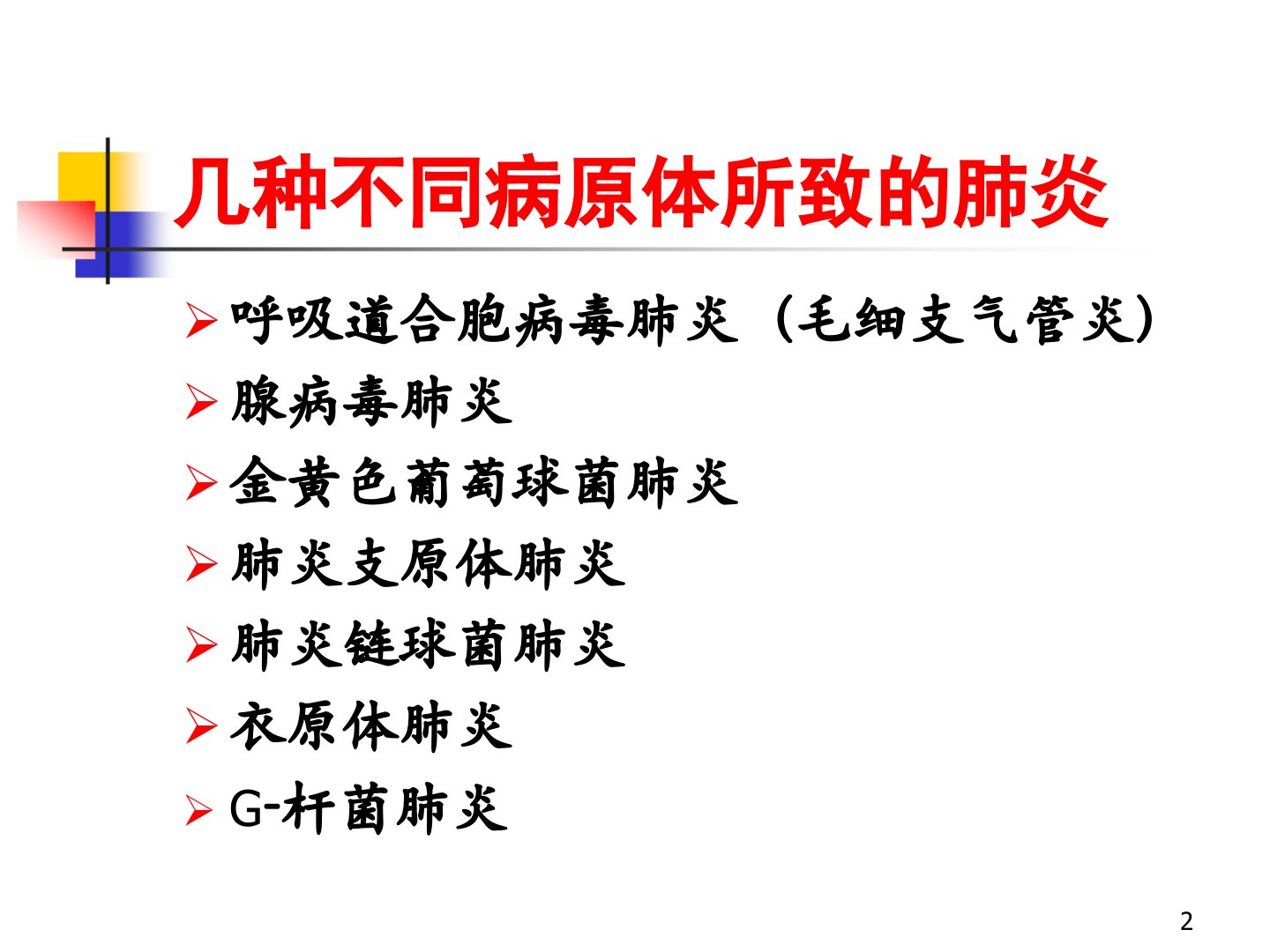 几种不同病原体所致的肺炎几种不同病原体所致的肺炎呼吸道合胞病毒肺炎(毛细支气管炎)腺病毒肺炎金黄色葡萄球菌肺炎肺炎支原体肺炎肺炎链球菌肺炎衣原体肺炎G-杆菌肺炎大纲要求掌握几种不同病原体肺炎的临床特点和诊断掌握几种不同病原肺炎临床特点的比较熟悉几种不同病原肺炎的胸片了解几种不同病原肺炎治疗原则进展:支原体肺炎的影像和内镜特点呼吸道合胞病毒肺炎(respiratorysyncytialviruspneumonia)毛细支气管炎(bronchiolitis)呼吸道合胞病毒(respiratorysyncytialvirus,RSV)A、B两个亚型(我国以A亚型为主)一、病因二、病理生理上皮坏死、脱...