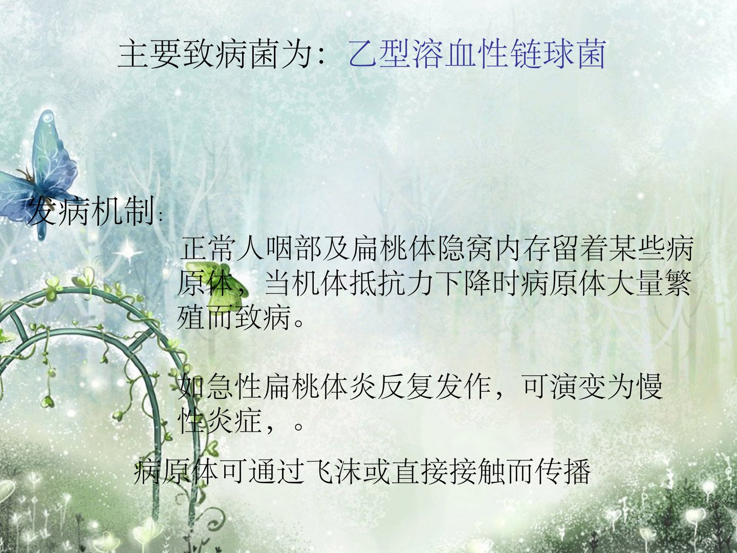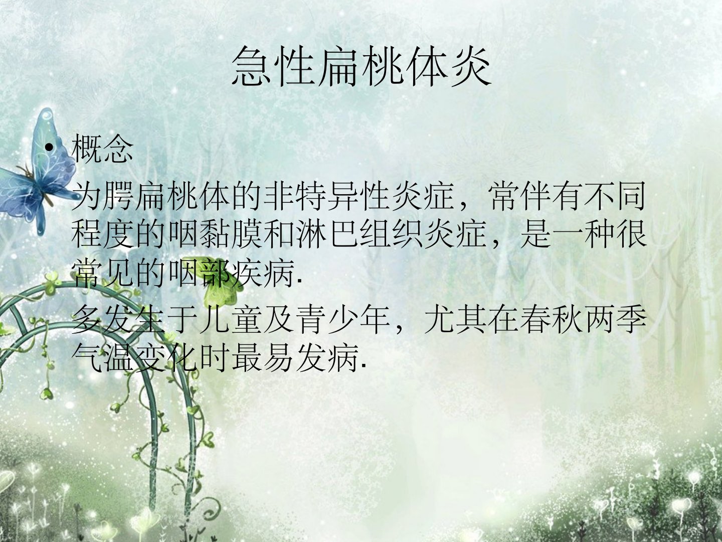 急性扁桃体炎的治疗及护理摘要急性扁桃体炎是腭扁桃体的非特异性炎症常伴咽黏膜和淋巴组织炎症多见于儿童及青少年春秋两季高发主要致病菌为乙型溶血性链球菌。分型包括急性卡他性和急性化脓性扁桃体炎后者又分急性滤泡性和急性隐窝性。临床表现上急性卡他性扁桃体炎症状较轻急性化脓性起病急、症状重常有发热、畏寒等症状幼儿可能呼吸困难。治疗以应用抗生素为主首选青霉素咽痛剧烈或高热时可用解热镇痛药反复发作或伴有并发症者需在炎症消退后23周行扁桃体切除术。并发症包括局部和全身性的多种病症。护理方面需保持口腔清洁遵医嘱用抗生素鼓励进食高营养易消化食物观察患者体温、局部红肿及疼痛程度注意尿液变化等。健康指导包括锻炼身体、戒除烟酒、少食辛辣刺激性食物、注意口腔卫生、适当隔离等频繁发作或有并发症者建议手术治疗。文章还介绍了慢性扁桃体炎及扁桃体周围脓肿的相关知识。