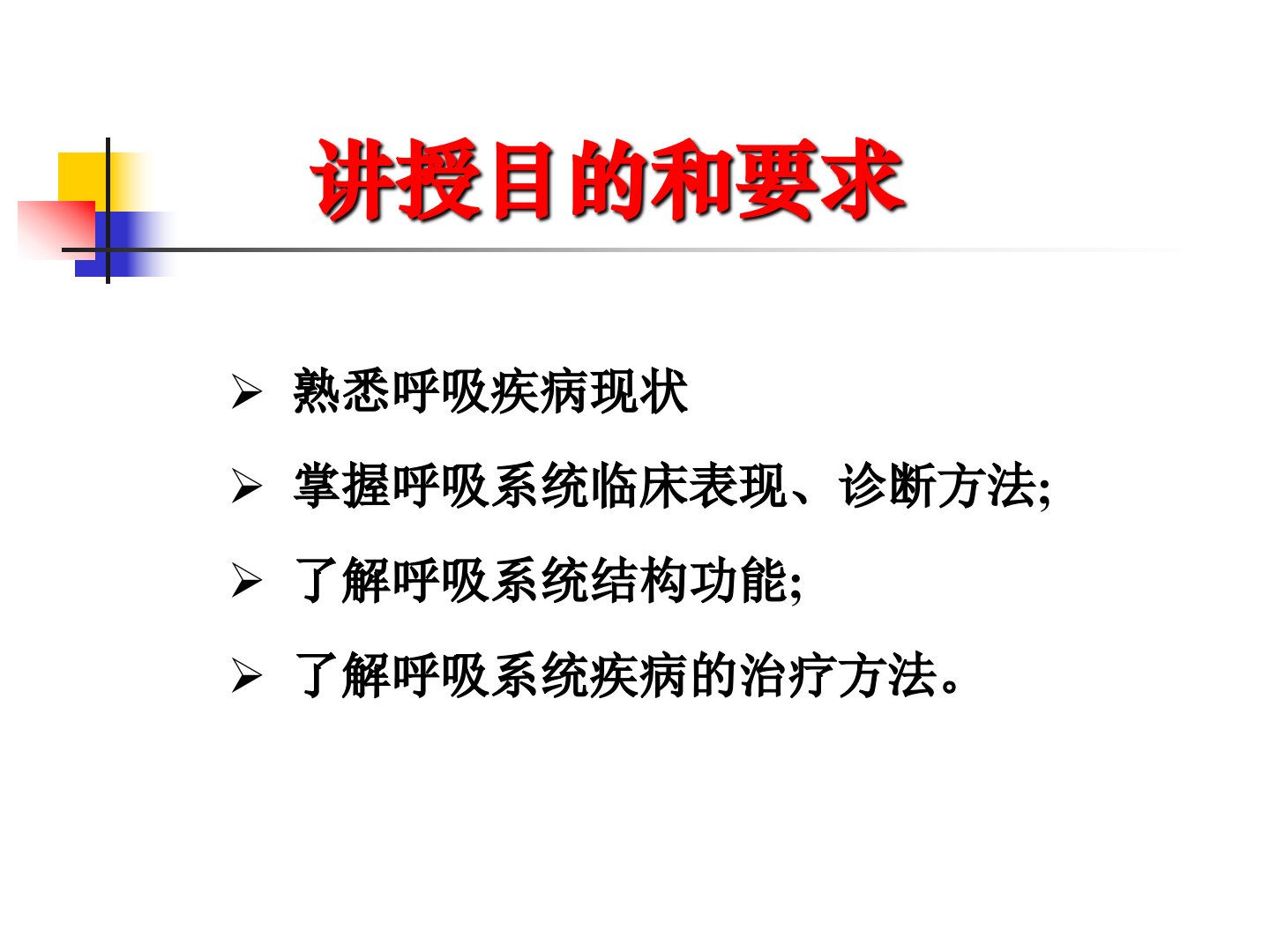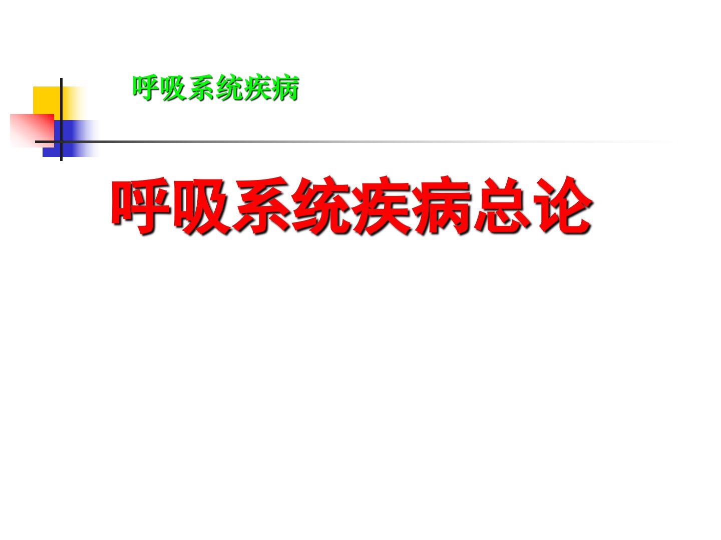 本文为呼吸系统疾病总论概述主要内容如下:1讲授目的和要求:熟悉呼吸疾病现状掌握临床表现、诊断方法了解结构功能及治疗方法。2呼吸疾病谱与现状:感染、慢阻肺、肿瘤、肺间质病变为主要死因发病率逐渐增加常见病多新呼吸系疾病不断发现。原因包括大气污染、吸烟、老龄化等导致慢阻肺、肺癌、哮喘等明显增加。3结构功能与疾病关系:肺与外界相通进行气体交换有害物质吸入可引起病变。防御功能下降或外界刺激过强会导致呼吸系统病变。肺与全身相通自身免疫和代谢的全身疾病都可累及肺部。4疾病增加因素:包括大气污染和吸烟、吸入变应原增加、肺部感染病原学的变异及耐药性增加、社会人口老龄化等。5呼吸系统疾病诊断:通过病史、症状、体征、实验室和其他检查进行诊断。6呼吸系统疾病现状与防治展望:危害人民身体健康治疗愈来愈困难发病率和死亡率仍不断上升。劝阻吸烟、减少空气污染是预防关键。检测技术发展使诊断更准确新抗生素提供更有效治疗。