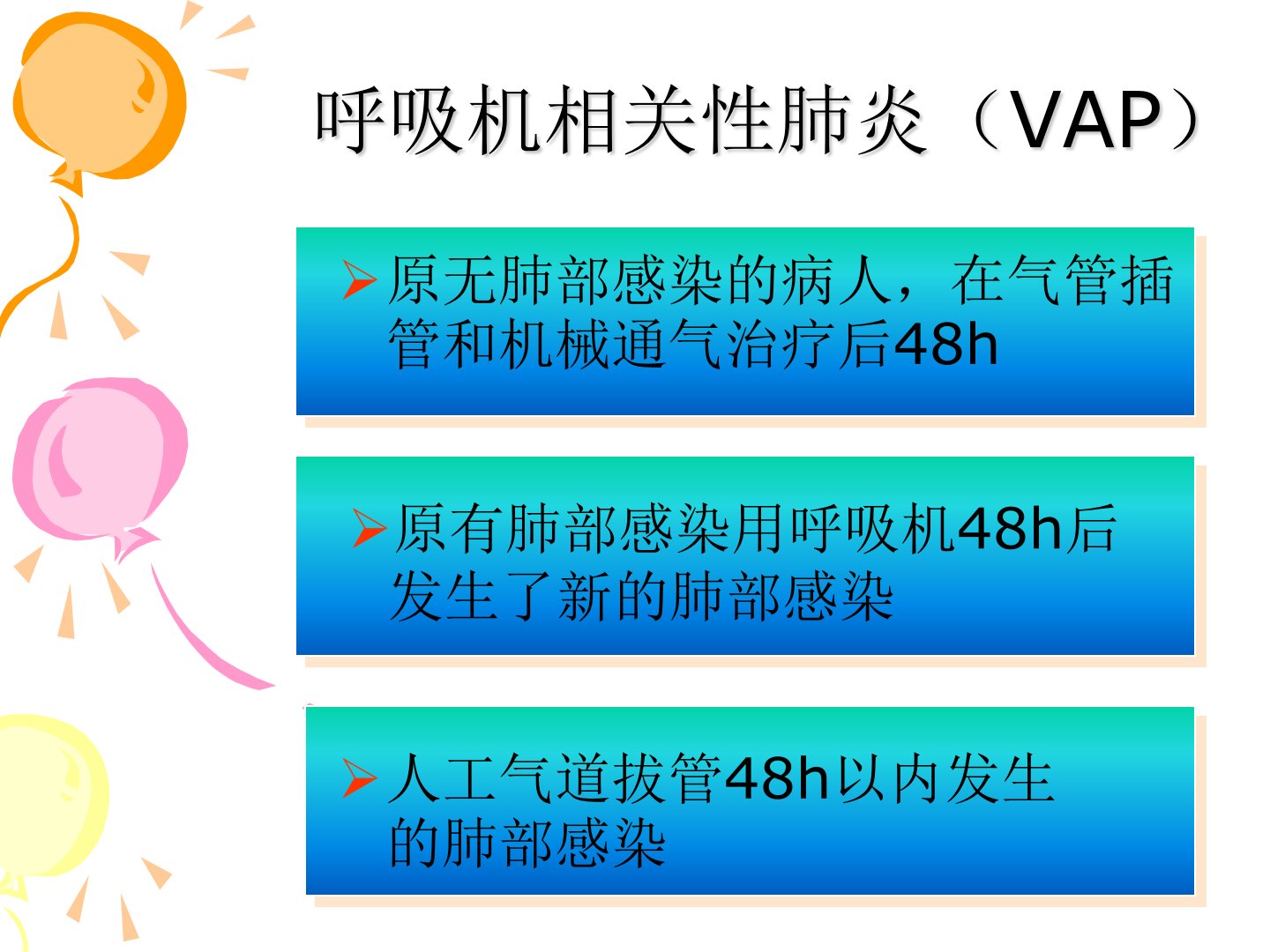 承德市中心医院刘凤指出呼吸机相关性肺炎(VAP)指原有肺部感染用呼吸机48h后或人工气道拔管48h内发生新的肺部感染会导致住院时间延长、经济负担加重、病死率增高。发生VAP的高危因素包括:环境方面ICU病房空间小治疗器械产生气溶胶颗粒增加吸入感染机会;宿主方面接受机械通气治疗的患者多伴有昏迷、营养不良等;药物方面大剂量联合用药导致菌群失调及耐药菌株出现;气管插管机械通气方面破坏呼吸道防御功能气管插管、鼻腔阻塞等导致细菌进入下呼吸道呼吸机管路冷凝水、气管导管表面细菌生物膜等也会导致VAP。预防VAP需采取一般性护理措施如洗手、半卧位、肠内营养等以及与机械通气相关的护理措施如保持气管套管气囊适当压力、声门下吸引、呼吸机管道管理等还应减少机械通气时间仔细评估脱机试验避免或减少再次插管。