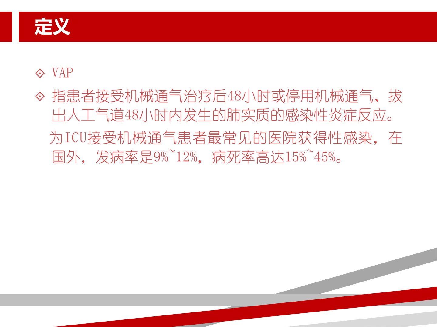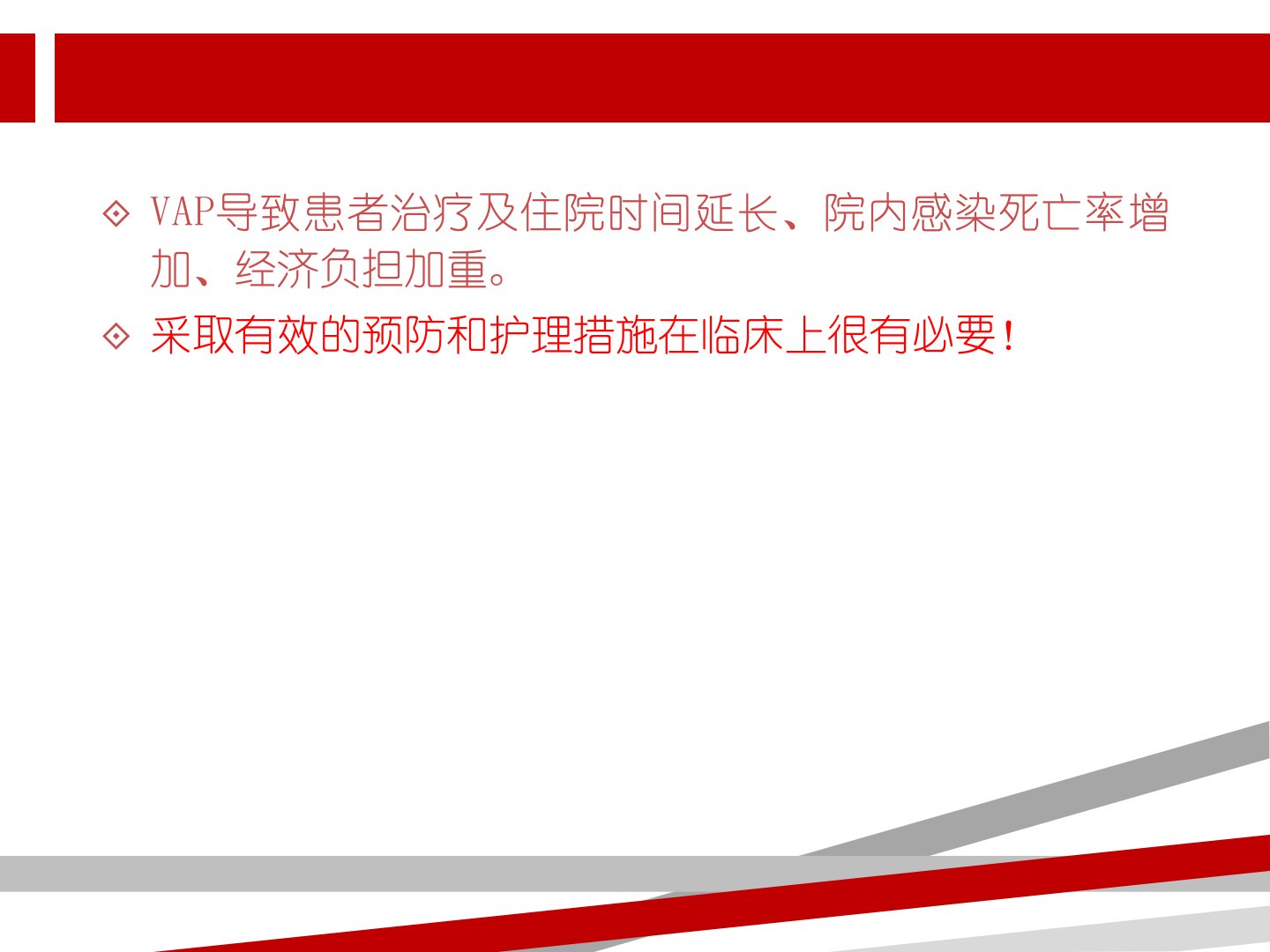 呼吸机相关性肺炎(VAP)是ICU机械通气患者常见的医院获得性感染其发病率和病死率较高会导致患者治疗及住院时间延长、经济负担加重因此有效的预防和护理措施十分必要。VAP的诊断包括传统和国际标准后者考虑了氧合指数和病原学检查。VAP的发生与多种因素有关如机体免疫力低下、细菌在上呼吸道定植、胃内酸碱度降低和细菌定植、呼吸机及相关装置引起的感染、人工气道的直接影响、体位影响、吸痰操作、医务人员因素以及空气环境等。预防措施包括加强病房管理、实行医院感染及微生物监测通报制度、保持呼吸道通畅等。护理措施包括严格无菌操作及洗手制度、口腔护理、减少胃内容物反流、严格呼吸机管理、人工气道的管理(维持理想的气囊压力、气囊上分泌物的清除、合适的气道湿化、适时的吸痰)、做好基础护理等。