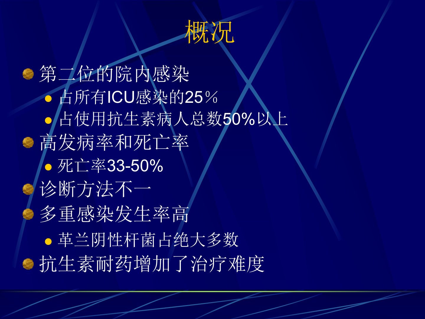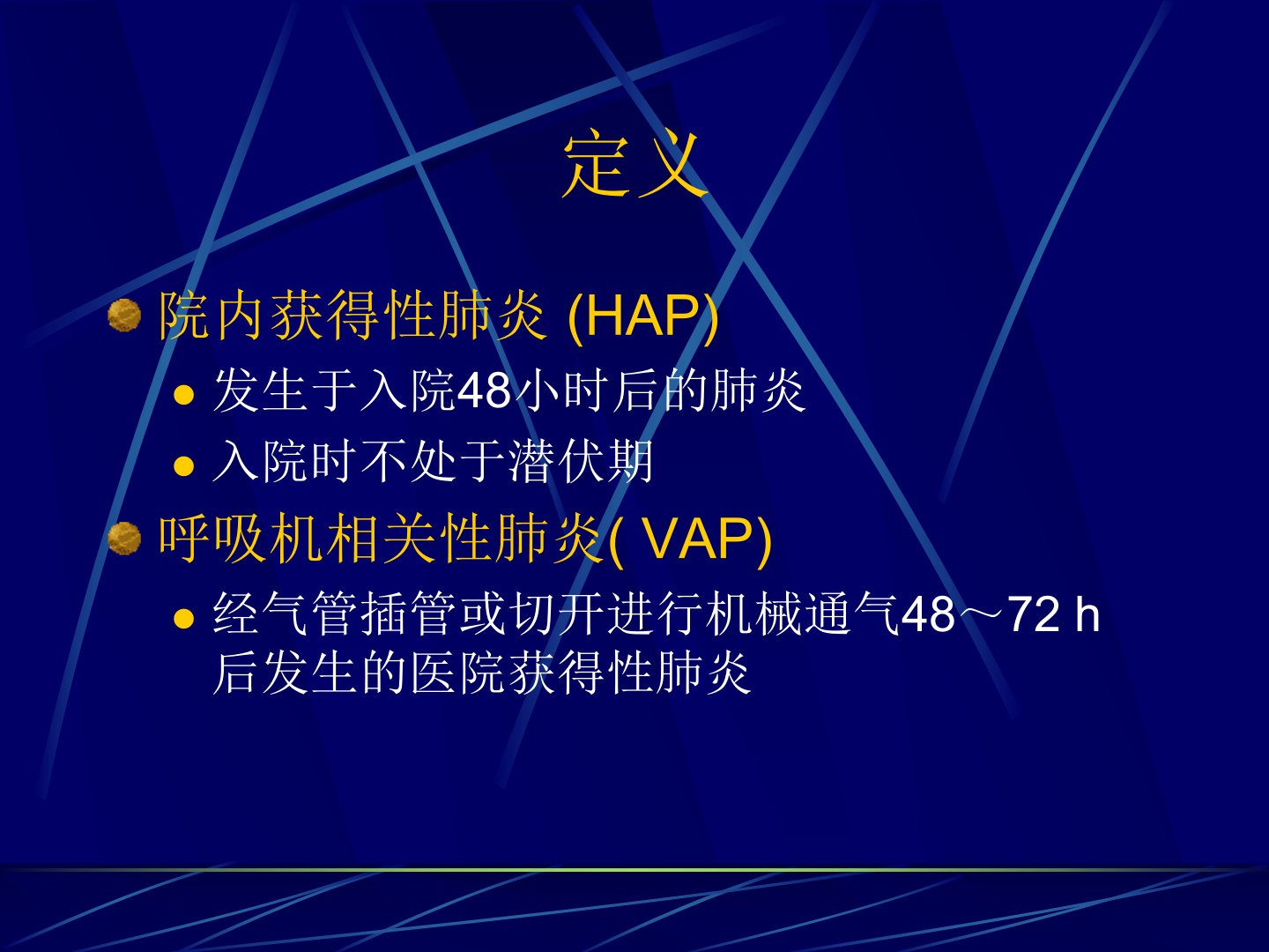 呼吸机相关肺炎(VAP)是院内获得性肺炎(HAP)的一种高发于入院48小时后且经气管插管或切开进行机械通气4872小时后的患者具有高发病率和死亡率(3350)。VAP通常由需氧革兰阴性杆菌导致多重耐药病原体常见抗生素耐药增加了治疗难度。诊断方法多样但肺组织病理学和微生物学检查是“金标准”临床应用困难。VAP的发生与呼吸道及全身防御机制受损、胃十二指肠定植菌逆行移位、吸入带菌气溶胶、细菌生物被膜形成等多种因素有关。治疗VAP时恰当使用抗生素至关重要不适当的治疗是死亡率增加和住院时间延长的主要危险因素。初始经验性抗生素治疗应根据有无MDR的危险因素选择医源性肺炎治疗应包括潜在的耐药菌。理想的抗生素治疗需要保证最大的治疗效果重度VAP患者可能需要联合治疗。治疗有反应的患者应予抗生素降阶梯治疗治疗无反应的患者应考虑其他因素。此外还需控制耐药菌谨慎使用H2受体拮抗剂强化胰岛素治疗等。