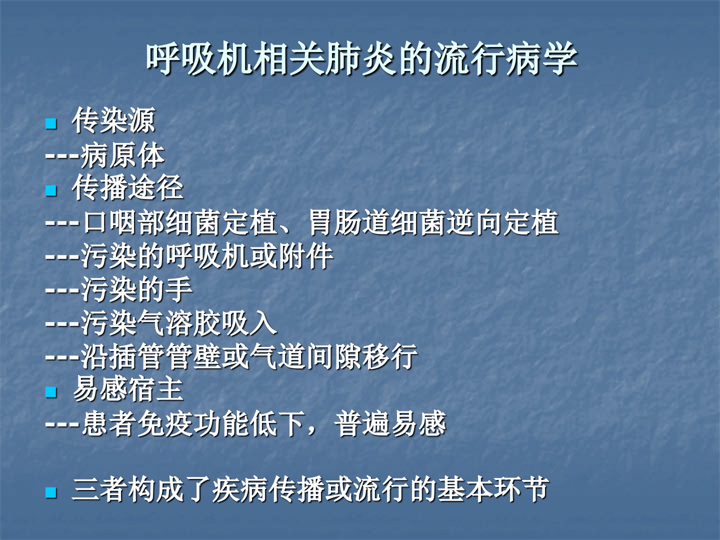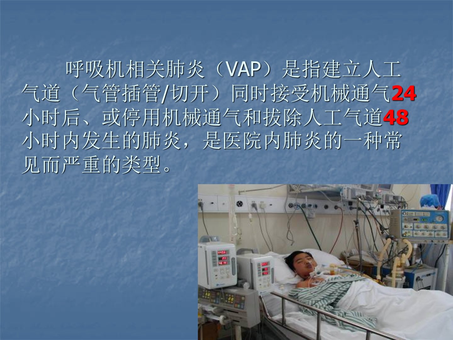 呼吸机相关肺炎(VAP)是医院内肺炎的常见严重类型指建立人工气道并接受机械通气24小时后或停用机械通气和拔除人工气道48小时内发生的肺炎。VAP的流行病学涉及传染源、病原体、传播途径及易感宿主。病原微生物方面VAP可由任何致病菌引起但以革兰氏阴性细菌为主约占6079多为混合感染病毒和厌氧菌少见。VAP危险因素包括:建立人工气道、机械通气时间、呼吸机相关肺损伤、误吸反流与体位、外源性细菌感染、药物因素、细菌生物被膜、呼吸机环路污染、机体免疫功能低下及慢性阻塞肺部疾病等。预防VAP需遵循洗手制度、严格执行无菌技术操作、抬高床头、保持口腔鼻腔清洁、严格掌握气管插管或切开适应证、使用一次性吸痰管、及时处理螺纹管冷凝水、评估气囊压力、定期评估撤机和拔管可能性、防止意外拔管并注意呼吸机的清洁消毒及药物管理。