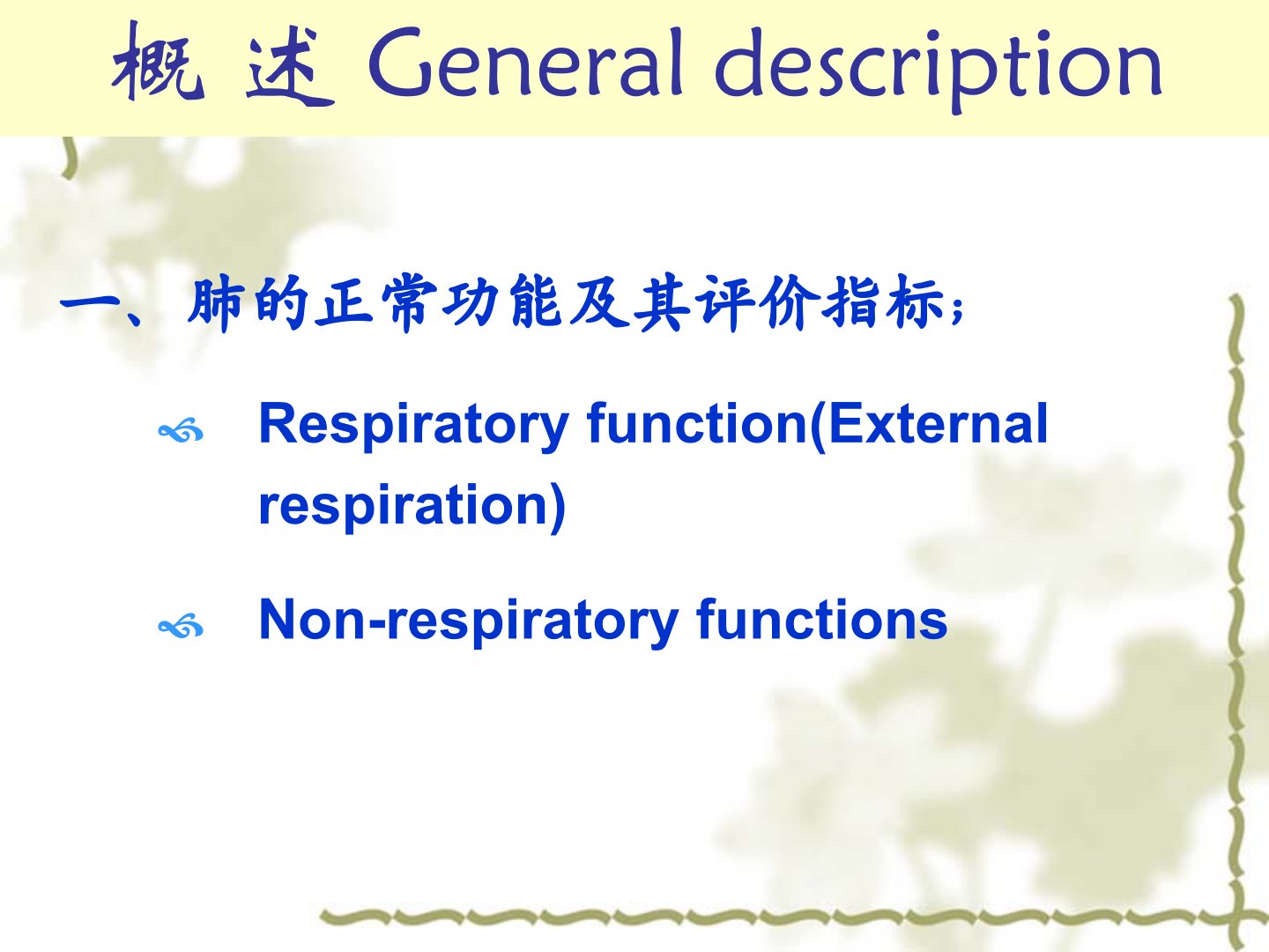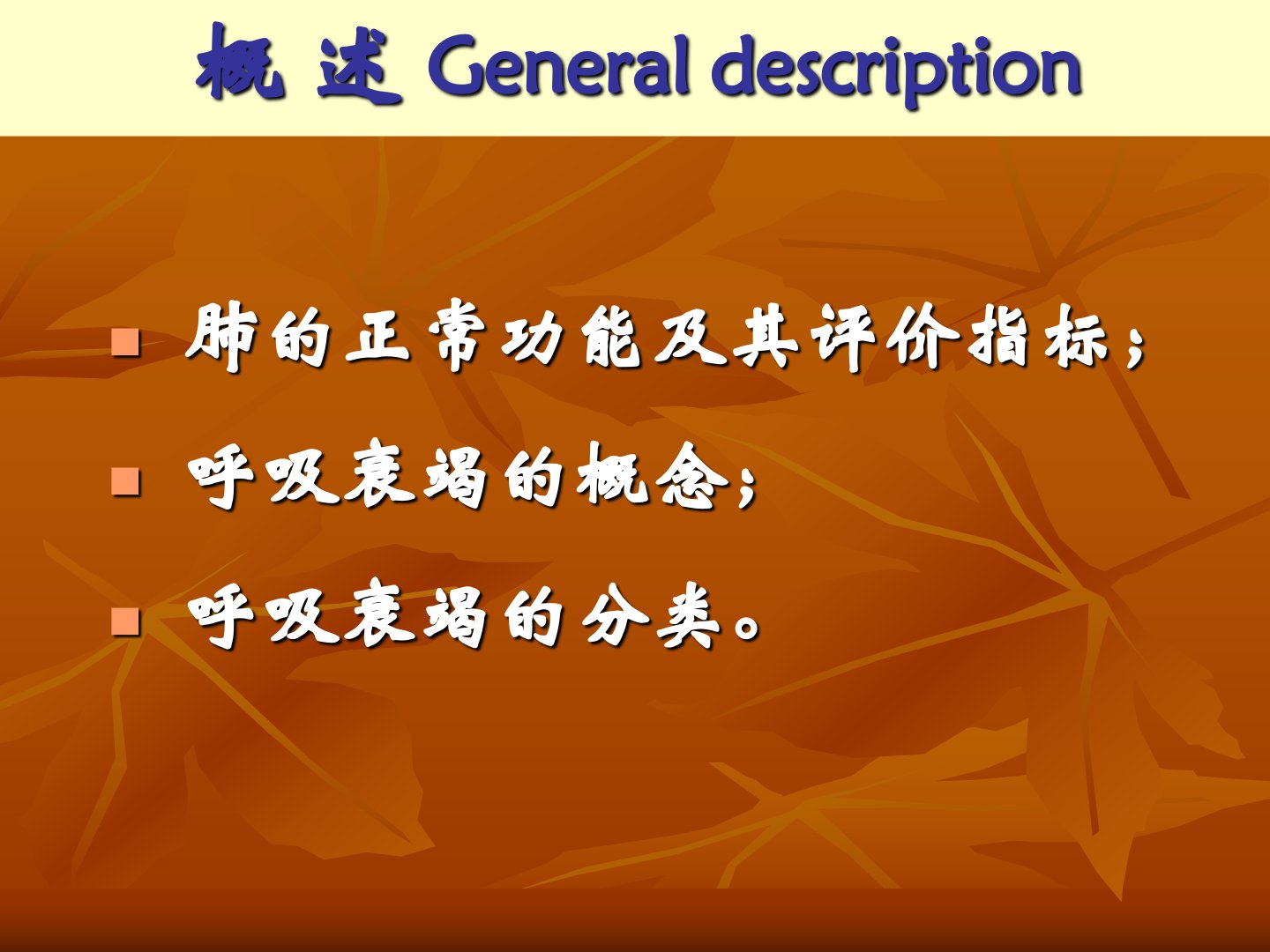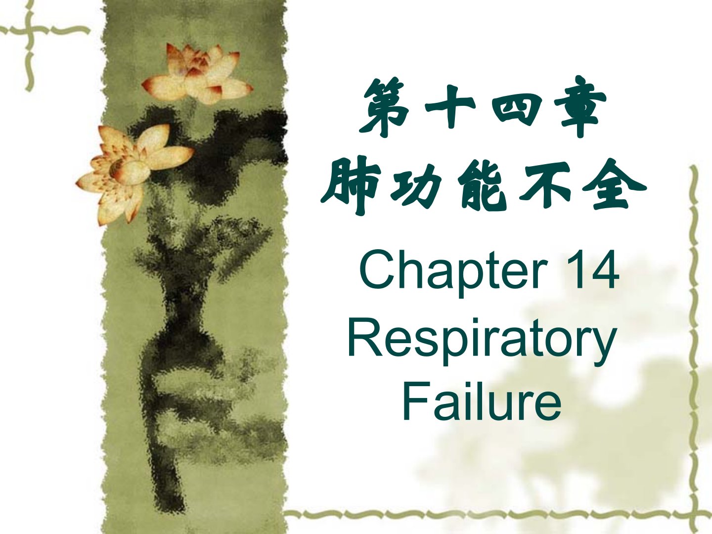第十四章肺功能不全Chapter14RespiratoryFailure概述Generaldescription肺的正常功能及其评价指标;呼吸衰竭的概念;呼吸衰竭的分类。一、肺的正常功能及其评价指标;Respiratoryfunction(Externalrespiration)Non-respiratoryfunctions概述Generaldescription呼吸功能的评价指标肺容量;肺通气功能的评价指标呼吸功能的评价指标肺弥散量(diffusingcapacity):指气体在分压差作用下,每分钟经肺泡膜弥散的容量。正常值为:188ml/min·kPa。反映肺换气效率。肺泡气-动脉血氧分...