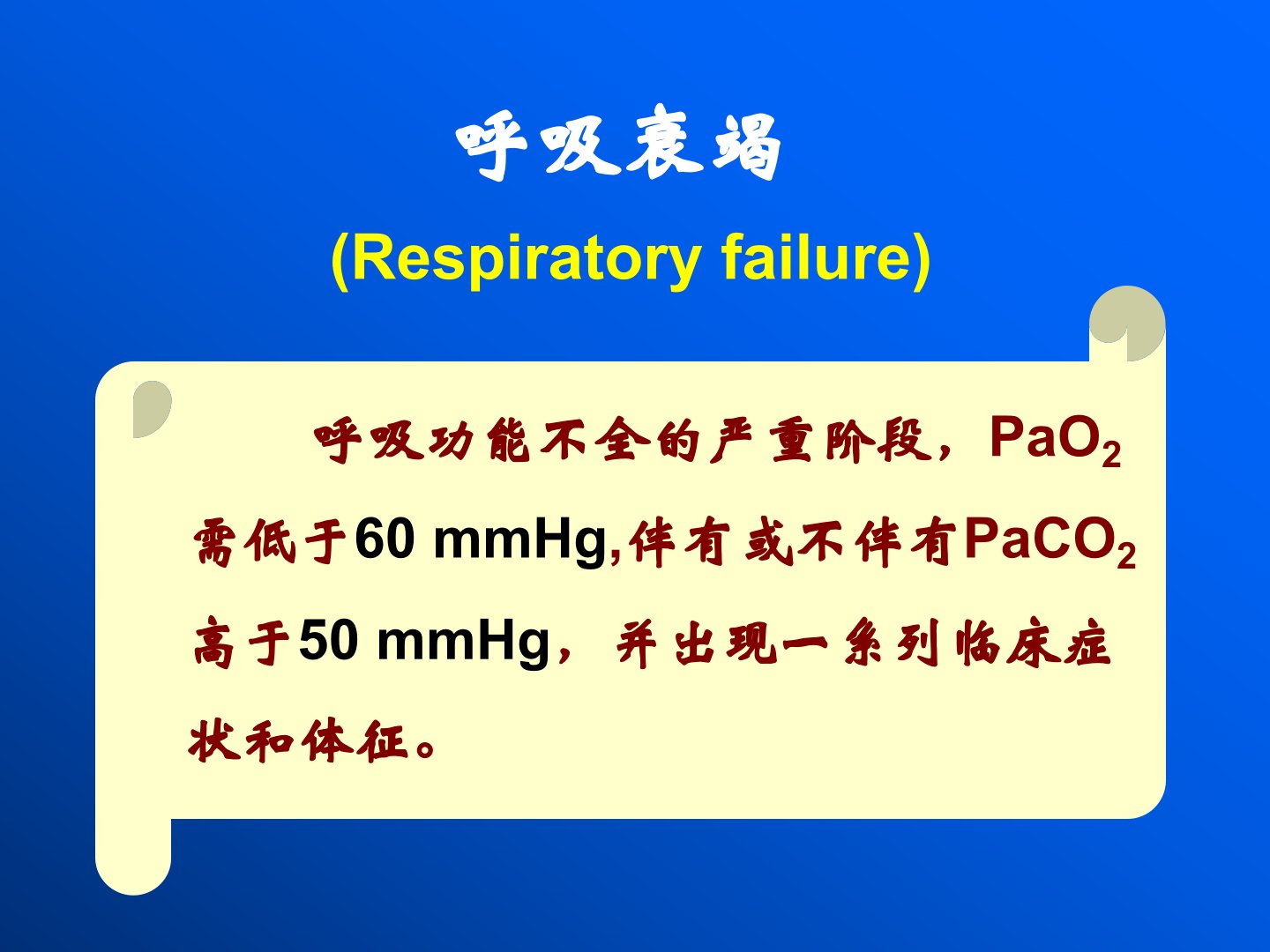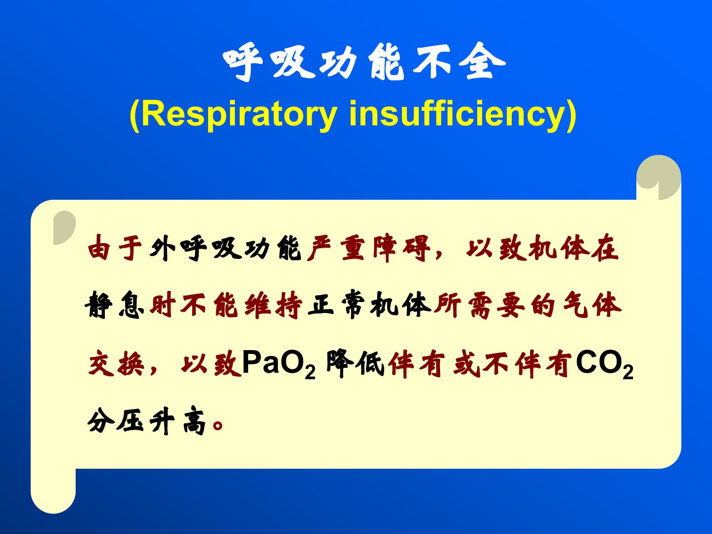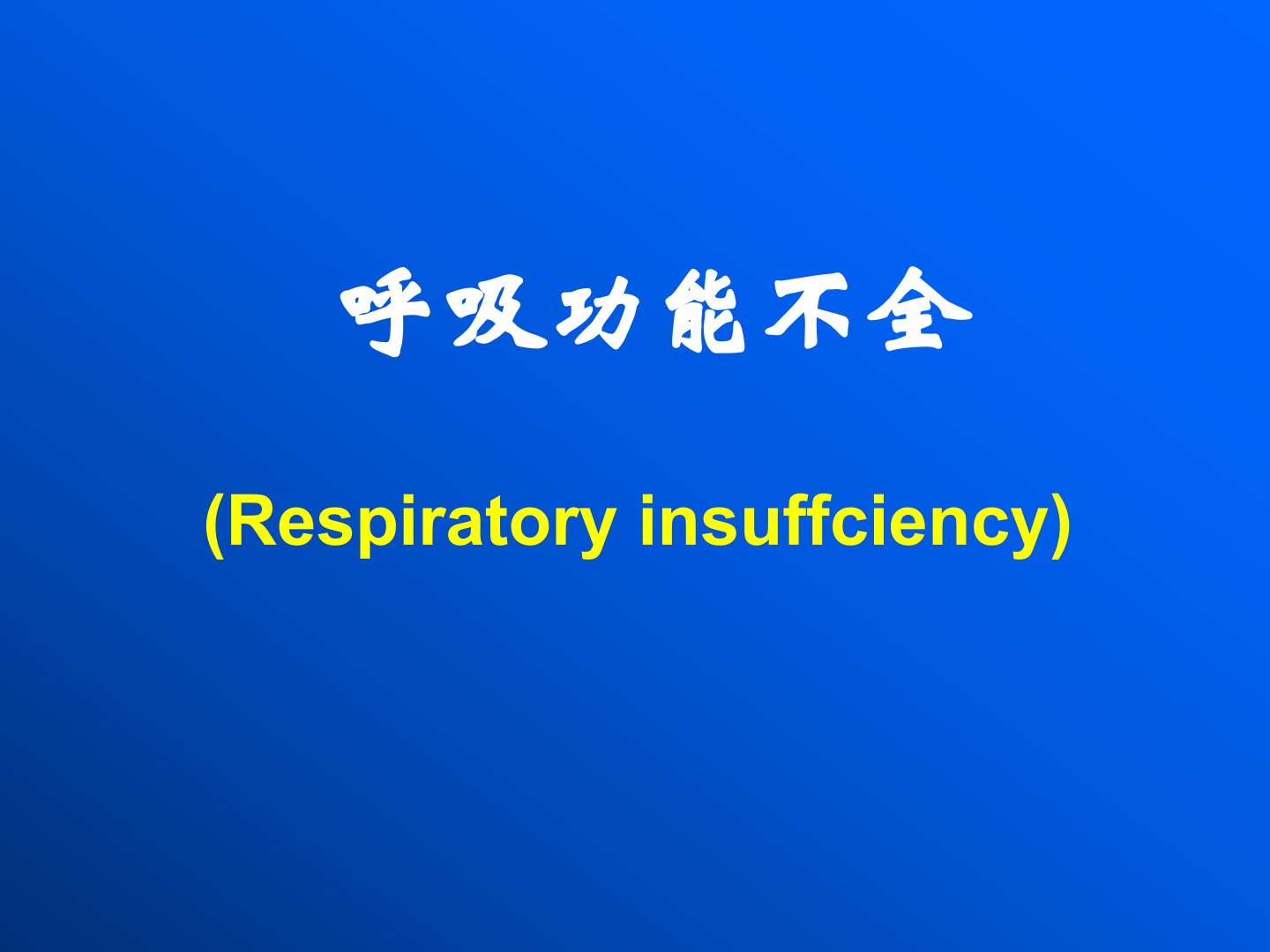 (Respiratoryinsuffciency)呼吸功能不全呼吸功能不全(Respiratoryinsufficiency)由于外呼吸功能严重障碍,以致机体在静息时不能维持正常机体所需要的气体交换,以致PaO2降低伴有或不伴有CO2分压升高。呼吸衰竭(Respiratoryfailure)呼吸功能不全的严重阶段,PaO2需低于60mmHg,伴有或不伴有PaCO2高于50mmHg,并出现一系列临床症状和体征。Ⅱ型呼吸衰竭PaO2↓PaCO2↑Ⅰ型呼吸衰竭PaO2↓第一节呼吸功能不全的原因和发病机制(Causesandmechanismsofrespiratoryinsufficiency)概述...