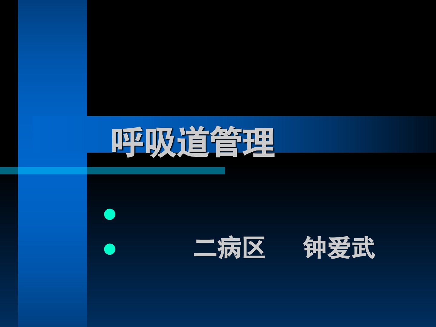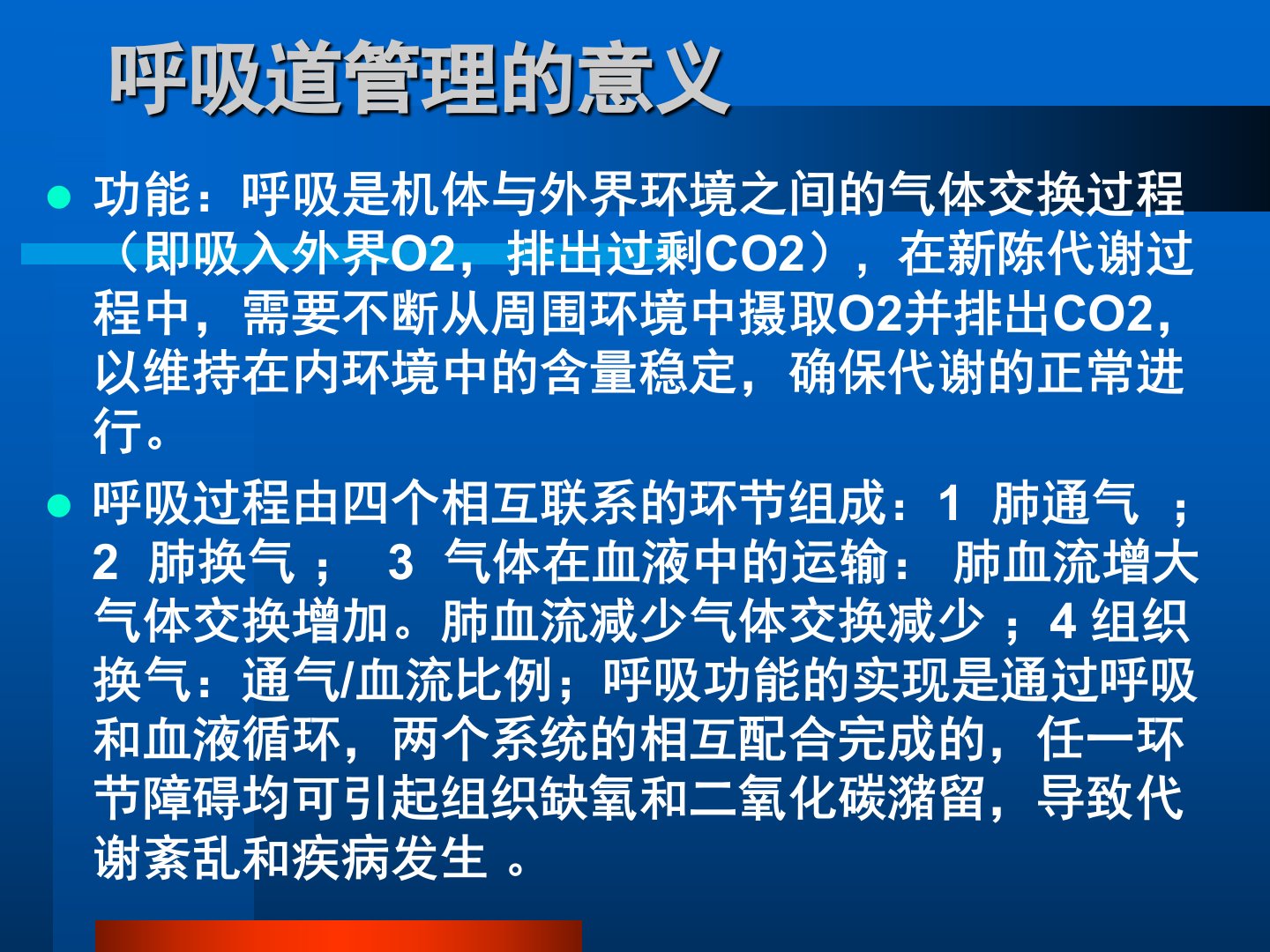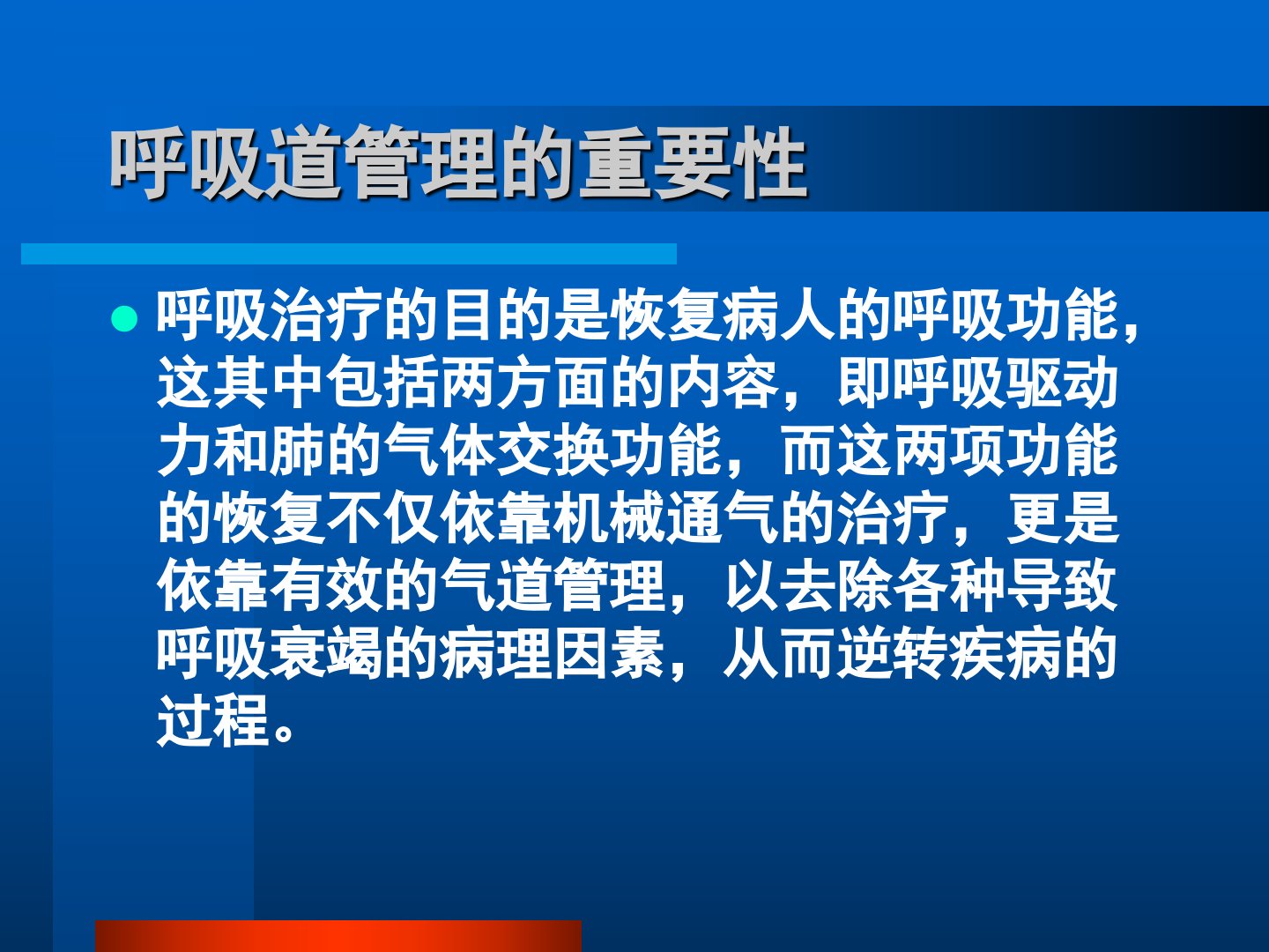 呼吸道管理二病区钟爱武呼吸道管理的意义功能:呼吸是机体与外界环境之间的气体交换过程(即吸入外界O2,排出过剩CO2),在新陈代谢过程中,需要不断从周围环境中摄取O2并排出CO2,以维持在内环境中的含量稳定,确保代谢的正常进行。呼吸过程由四个相互联系的环节组成:1肺通气;2肺换气;3气体在血液中的运输:肺血流增大气体交换增加。肺血流减少气体交换减少;4组织换气:通气/血流比例;呼吸功能的实现是通过呼吸和血液循环,两个系统的相互配合完成的,任一环节障碍均可引起组织缺氧和二氧化碳潴留,导致代谢紊乱和疾病发生。呼吸道管理的重要性呼吸治疗的目的是恢复病人的呼吸功能,这其中包括两方面的内容,即呼吸驱动力和...
